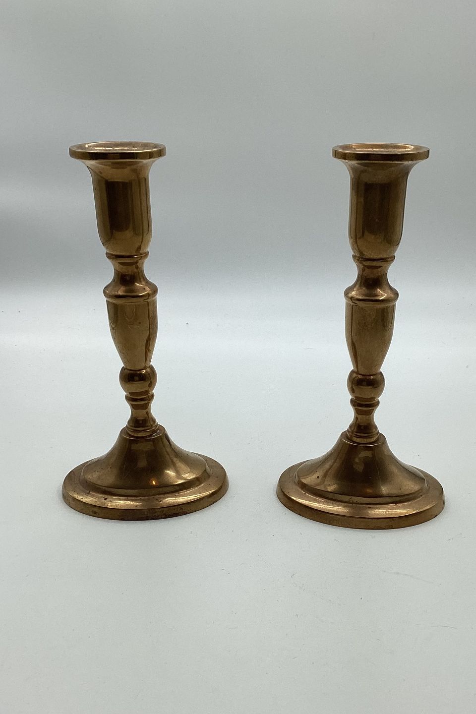 Pair of brass candlesticks. Produced in Denmark c. 1950. In good condition. At the bottom marked: Danish Handmade "Glinde Line". H. 19 cm (7.48 inches)