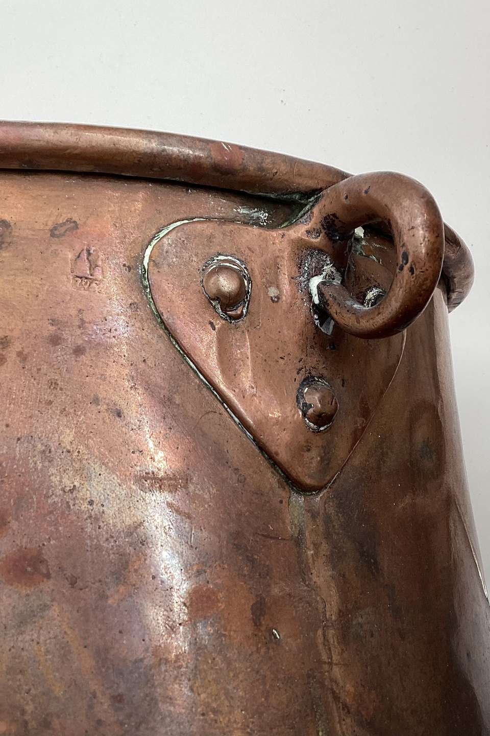 Large deep copper pot with two ears. Tinned inside. Made in Denmark in the middle of the 18th century. The factory mark next to one of the handles. In good condition. H. 20.5 cm (8.07 inches) from ear to ear 23 cm (9.05 inches) and aperture diameter of 25 cm (9.84 inches).