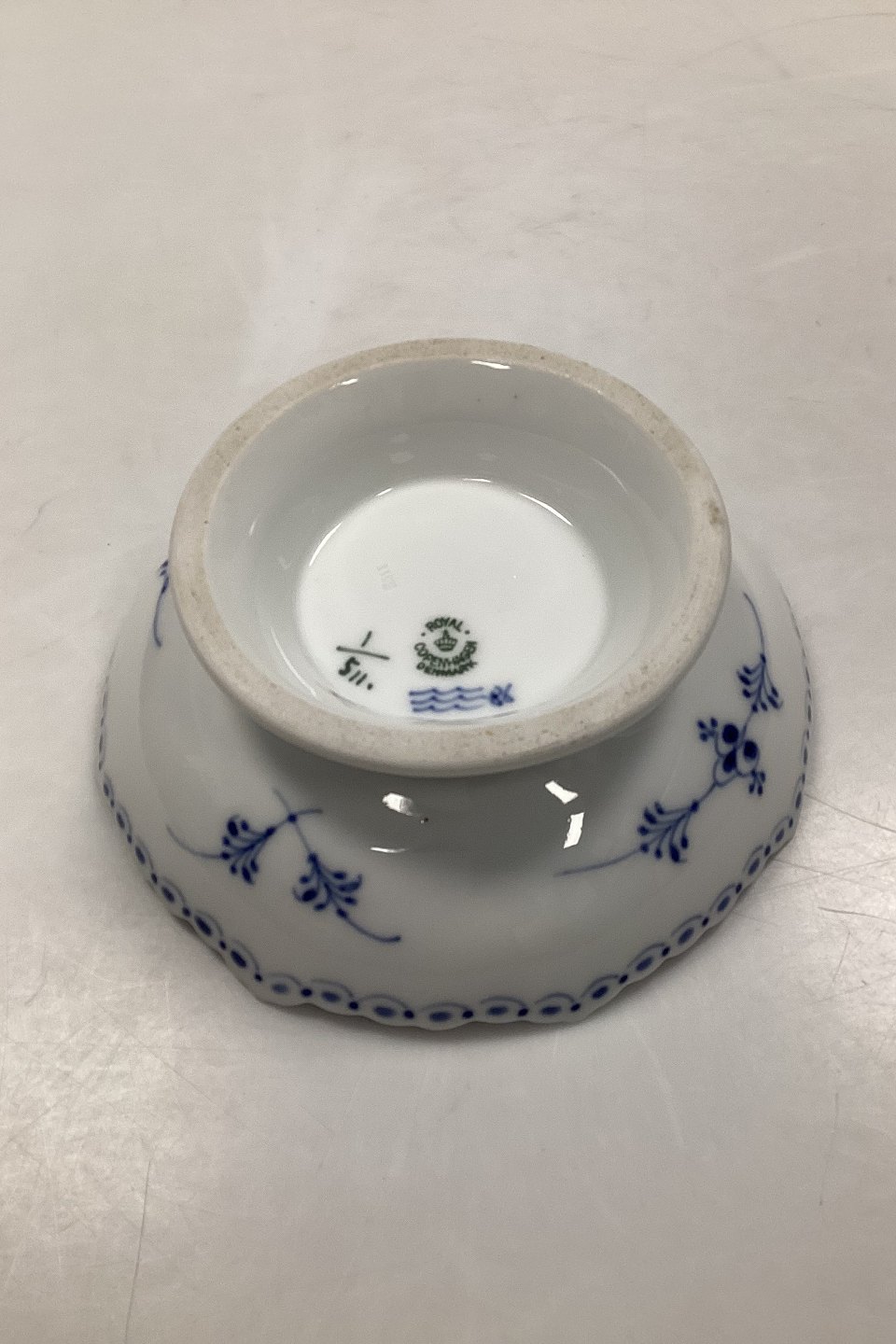 Royal Copenhagen Blue Fluted Half Lace Bowl on foot no 511. Measures 17.5 cm / 6 57/64 in. Has 2 chip on the edge, see pictures
