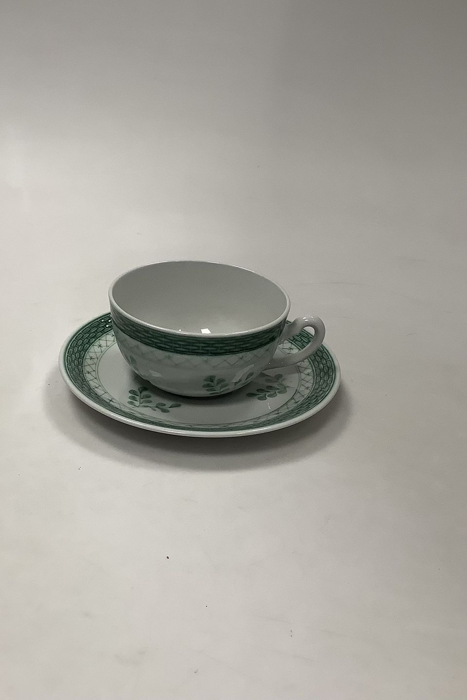 Royal Copenhagen Grøn Tranquebar Tea Cup and Saucer No 957. Measures Cup: 5.5 cm / 2 11/64 in. x 10 cm / 3 15/16 in. dia. Saucer 16 cm / 6 19/64 in.
