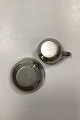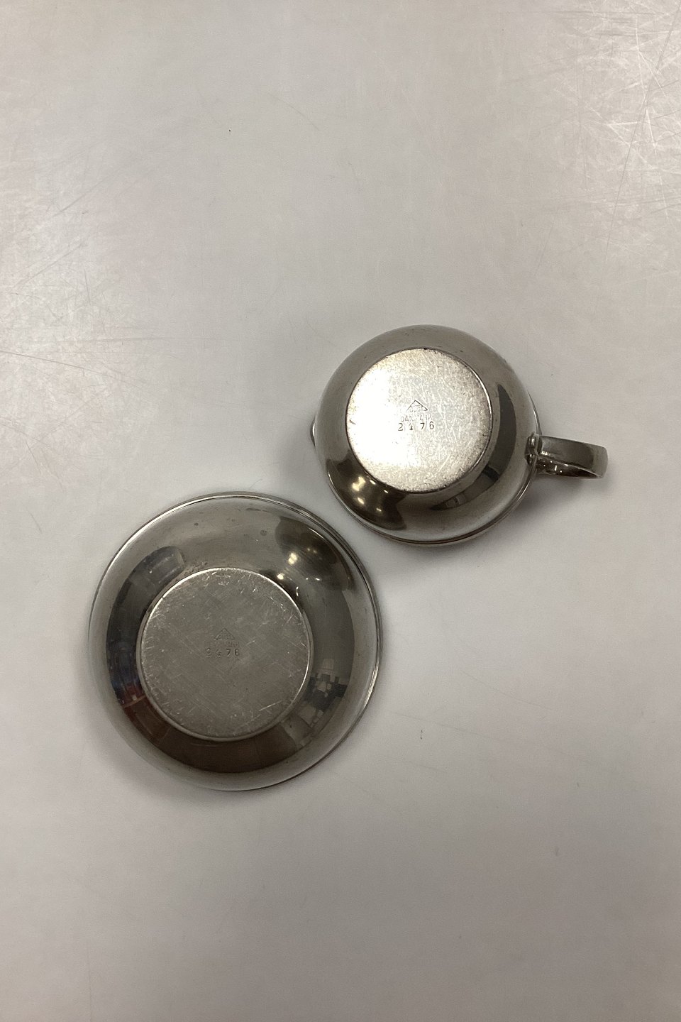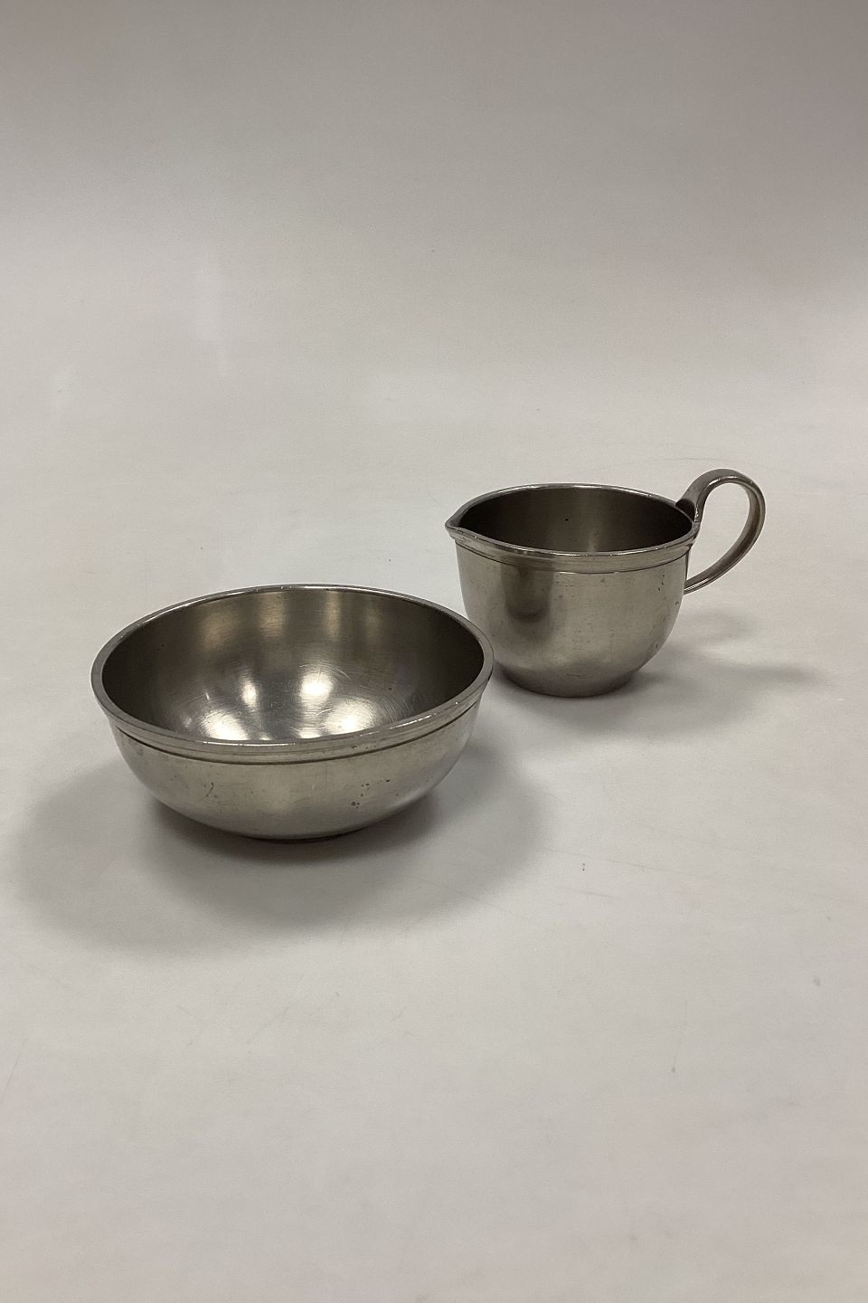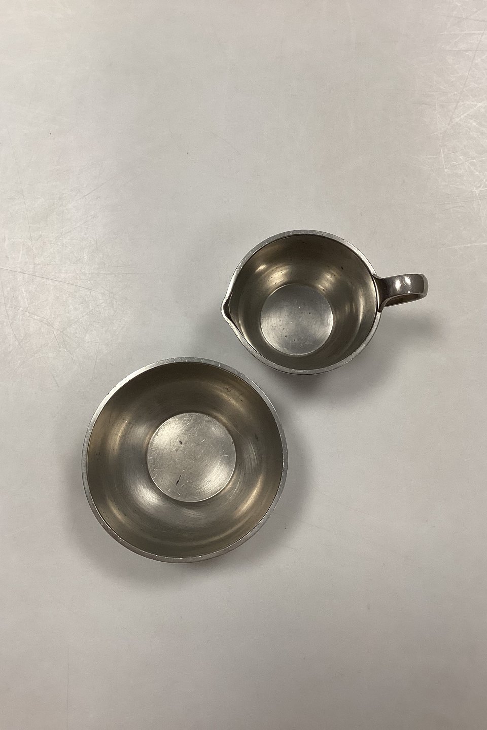 Just Andersen Pewter Creamer and Sugar Bowl No. 2476. The bowl measures 10.3 cm x 4.3 cm / 4.06 in. x 1.7 in. Jug measures with handle 10.3 cm x 5.4 cm / 4.06 in. x 2.13 in.