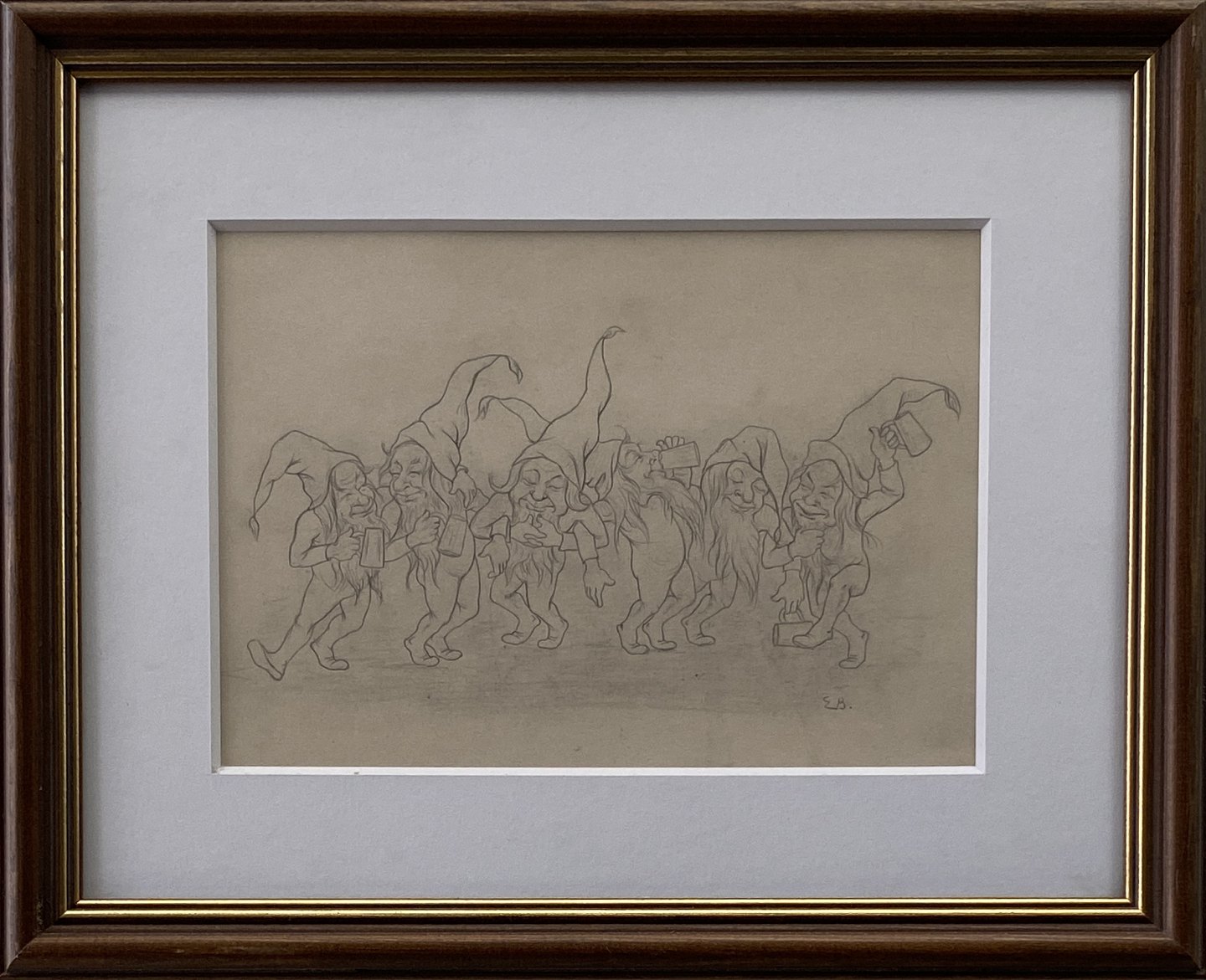 Eiler Braae 1878-1914. Pencil drawing with passepartout in black frame. Motif of the dancing elves. Dimensions: 25 x 31.5 cm. (14 x 20 cm) Signed EB