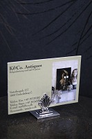 Old display for postcards, photos or business cards. The display is in black metal on a wooden base. . .