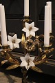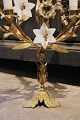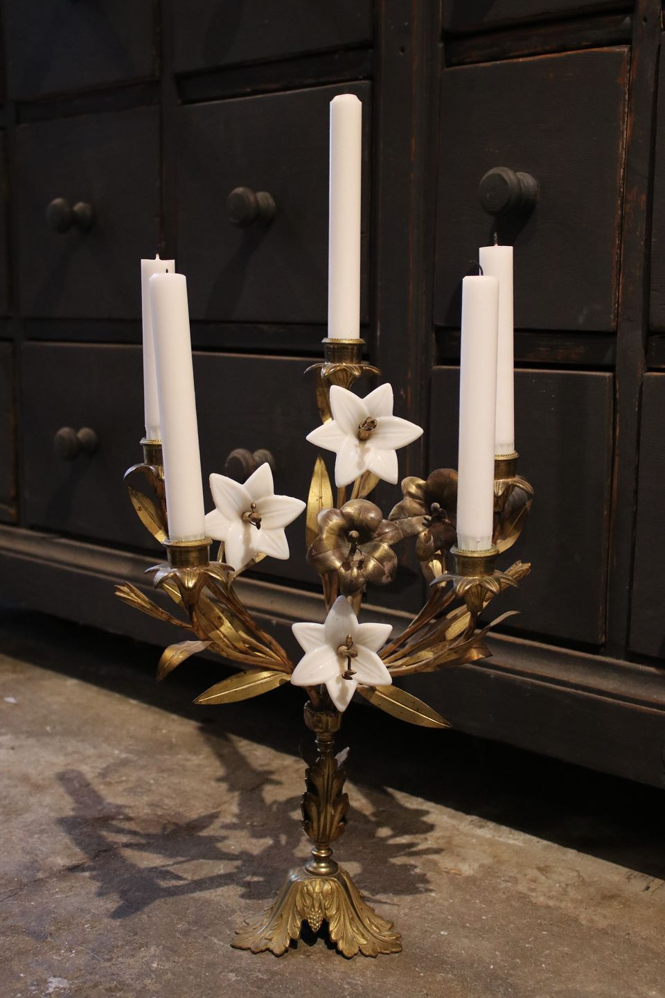Antique, decorative French church candlestick in bronze from the 19th century with space for 5 candles and decorated with 3 white opal glass flowers. H: 41cm. W: 30cm.