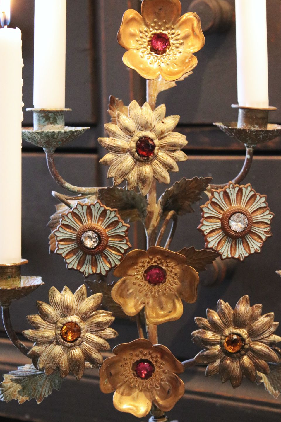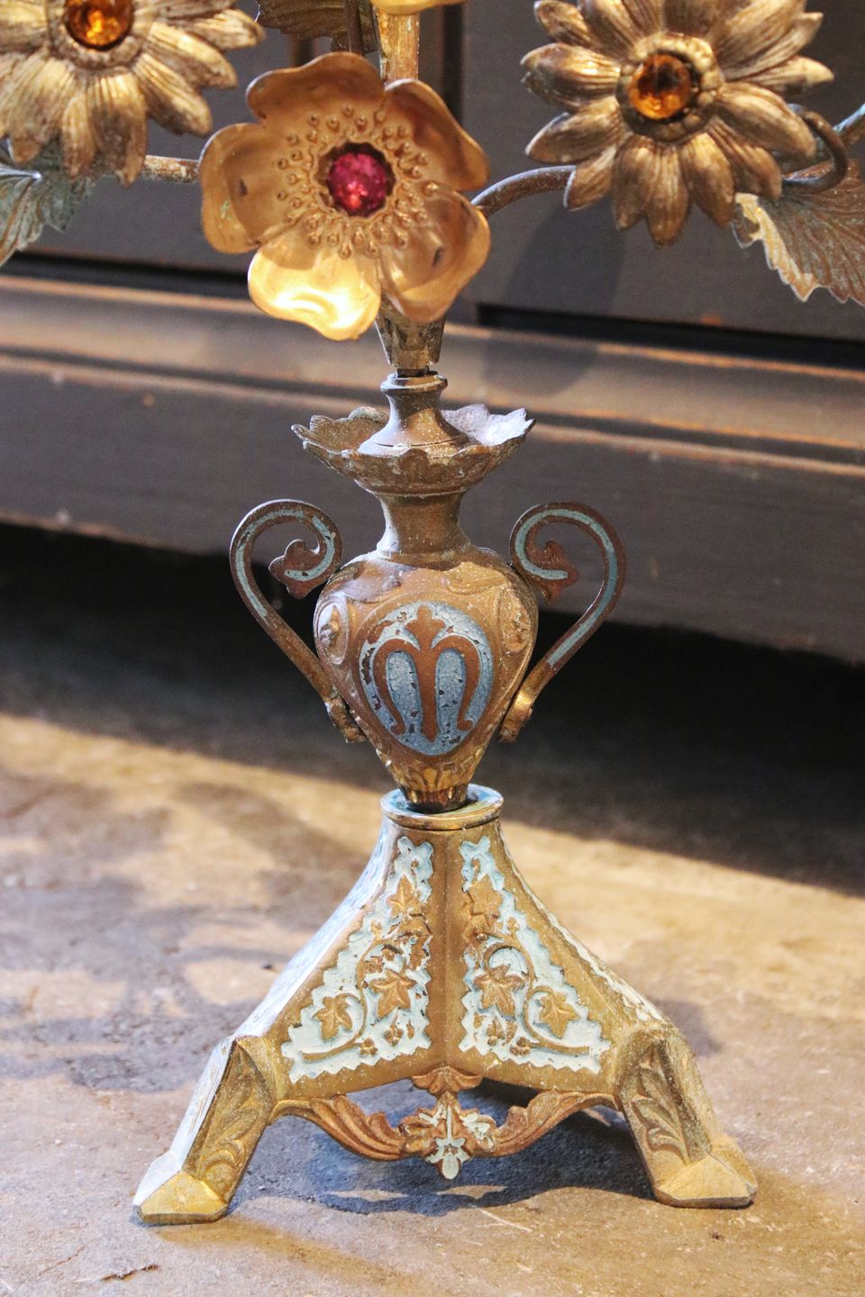 Antique, French church candlestick decorated with 8 fine metal flowers with colored stones...