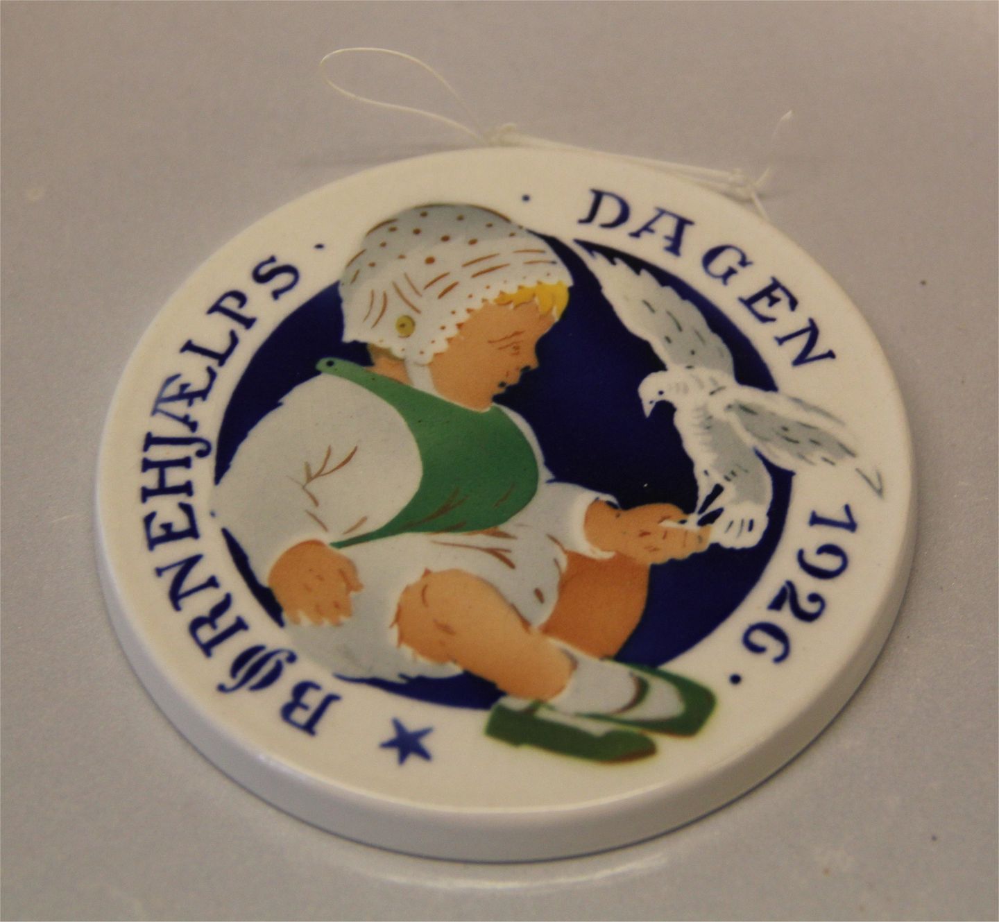 Royal Copenhagen Aluminia fajance Børnehjælpsplatte 1926 Barn med fugle Oscar WIllerup 8,7 cm