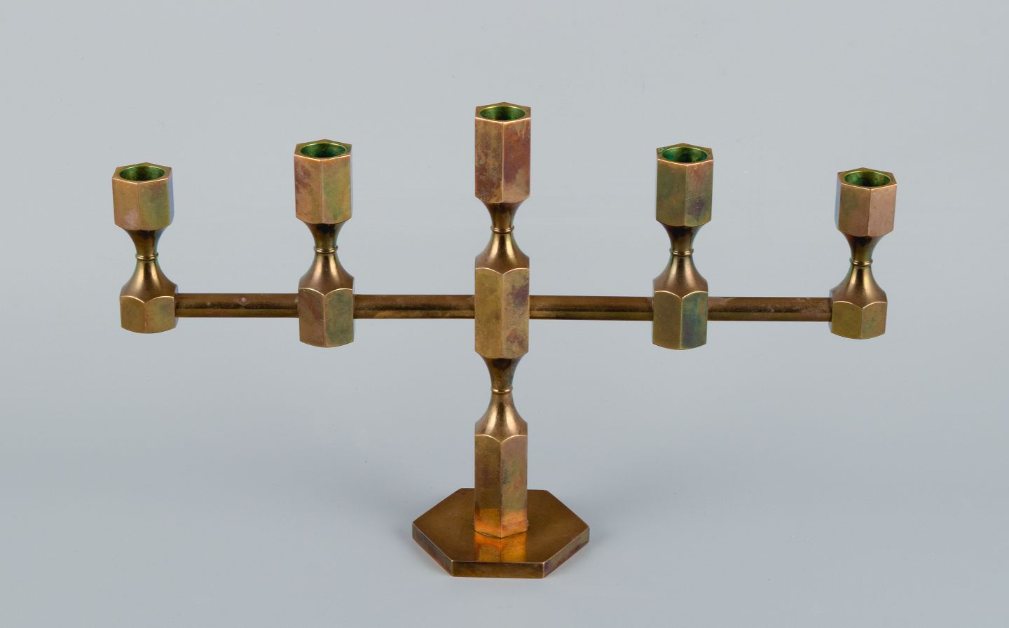 Gusum, Metallslöjd, brass candlestick - For five candles. Swedish modernist design. 1977. Marked. In excellent condition. Fits candles of 2.0 cm. Dimensions: L 37.0 x H 23.0 cm.