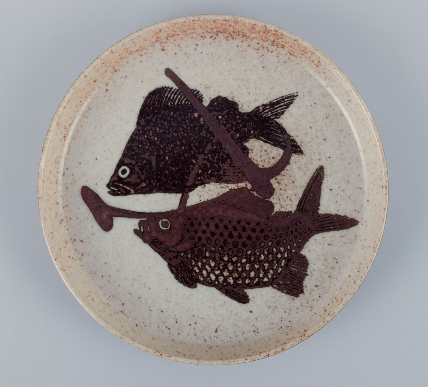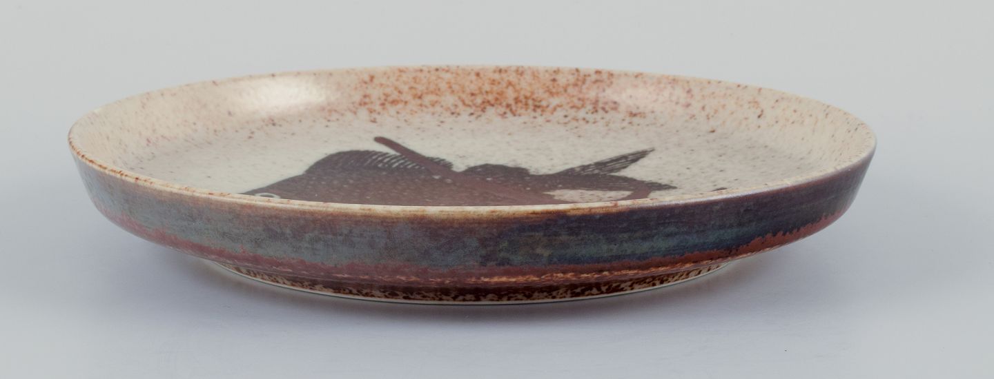 Nils Thorsson for Royal Copenhagen, unique ceramic dish decorated with fish. Glazed in brown tones.