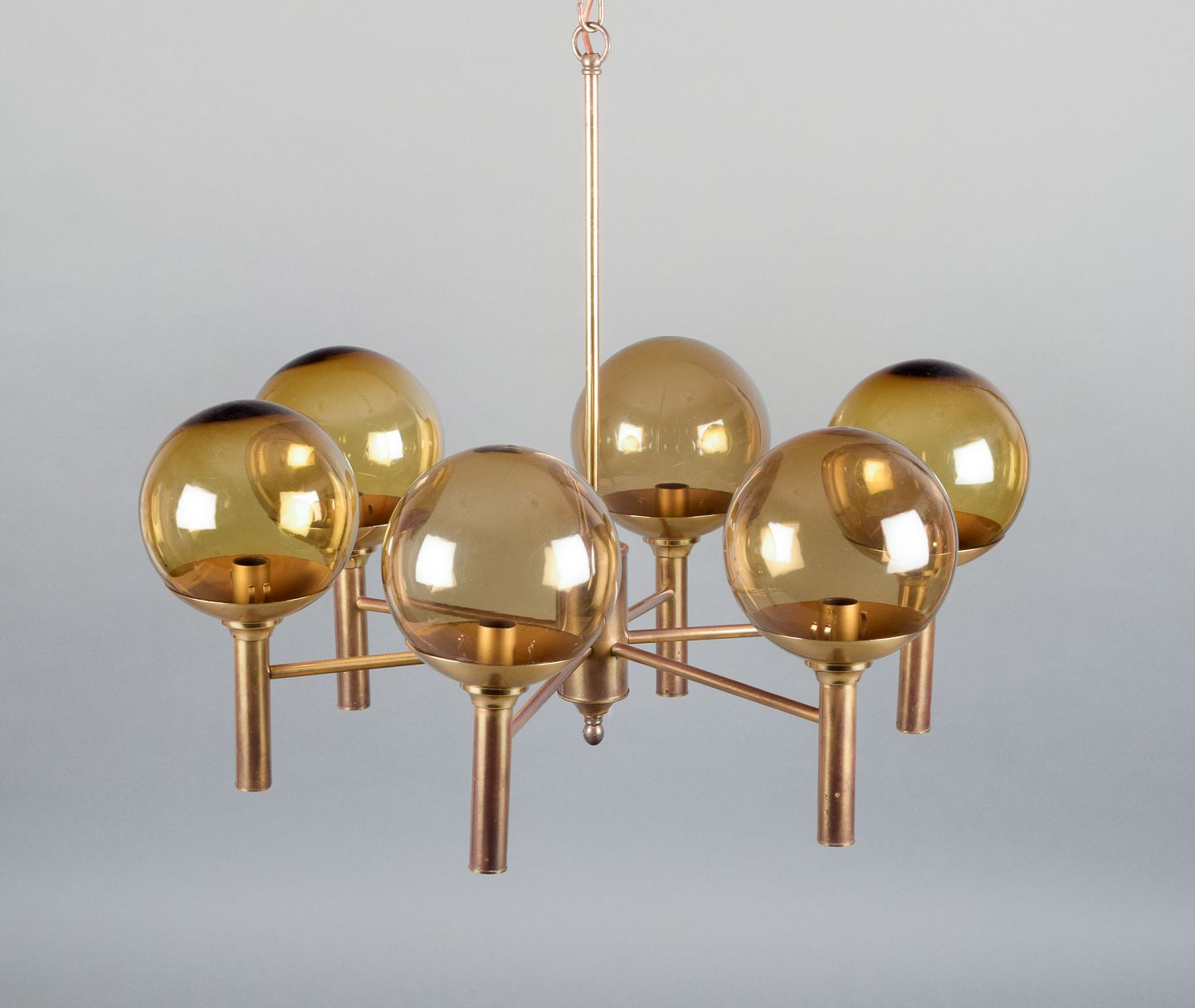Sv. Mejlstrøm, Danish designer. Brass chandelier with six arms and dome-shaped shades made of amber-colored glass. Mid 20th century. In perfect condition. Dimensions: H 54.0 cm x D 66.0 cm.