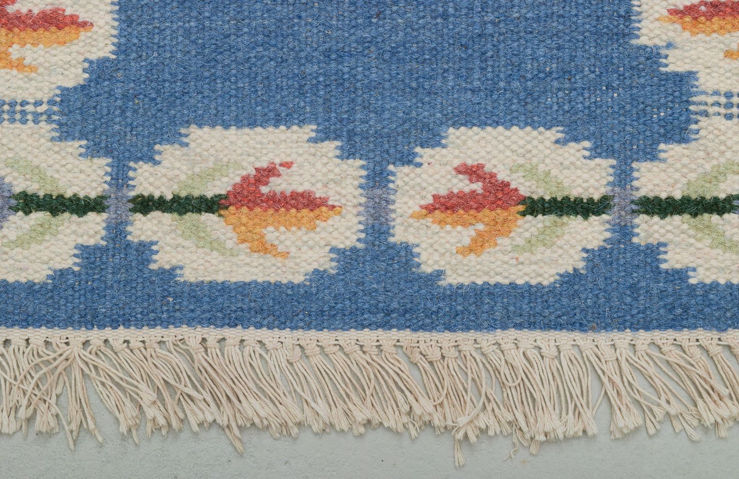 Swedish handwoven carpet in pure wool. Rölakan technique. Designed with flowers on a blue background. Mid-20th century. Perfect condition. Dimensions: 145 cm x 72 cm.
