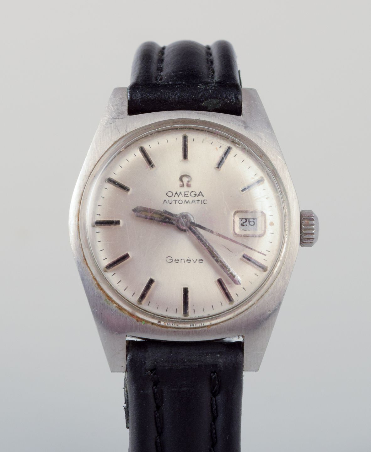 Omega Geneve ladies' wristwatch with a black leather strap. 1970s. In good condition with signs of use. The watch runs for a short time and requires servicing. Dial: 25 mm.