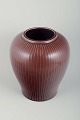 Organically shaped faience vase with a relief-decorated surface and deep burgundy glaze with vertical grooves accentuating the form.