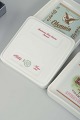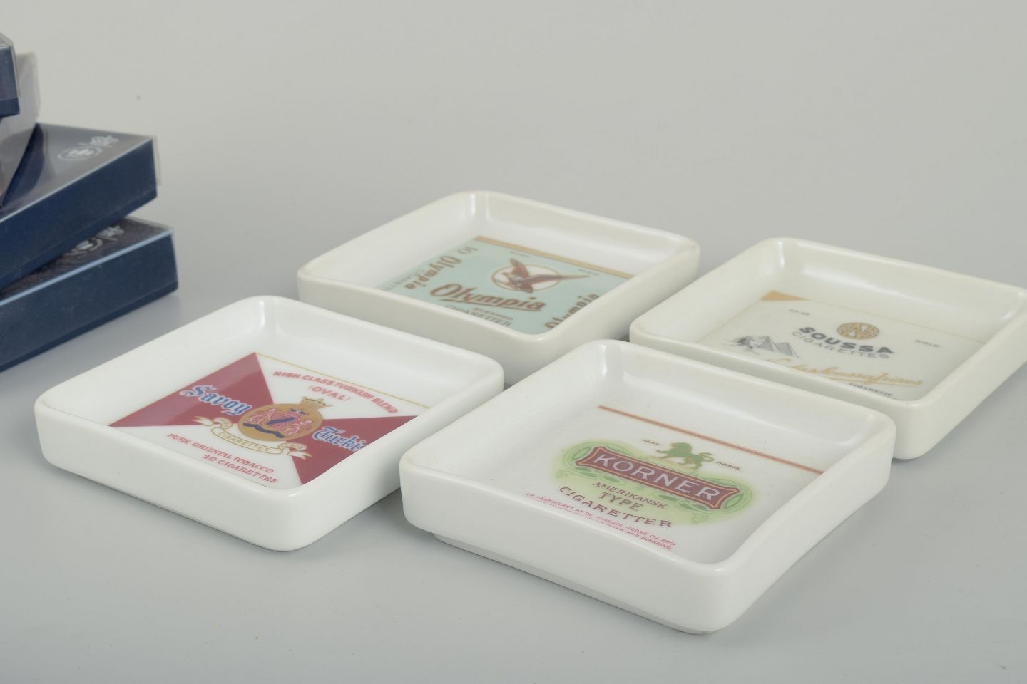 Set of four square porcelain ashtrays, each decorated with classic tobacco and cigar motifs: Olympia Cigarillos, Kornerup Cigars, Handelsgold Cigarillos and Senator Brasil. Supplied in original boxes.