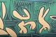 A vibrant and expressive work by Pablo Picasso, executed as a Linoleum cut in 1960, depicting a bacchanalian scene with figures and a bull in a stylized, almost archaic form.