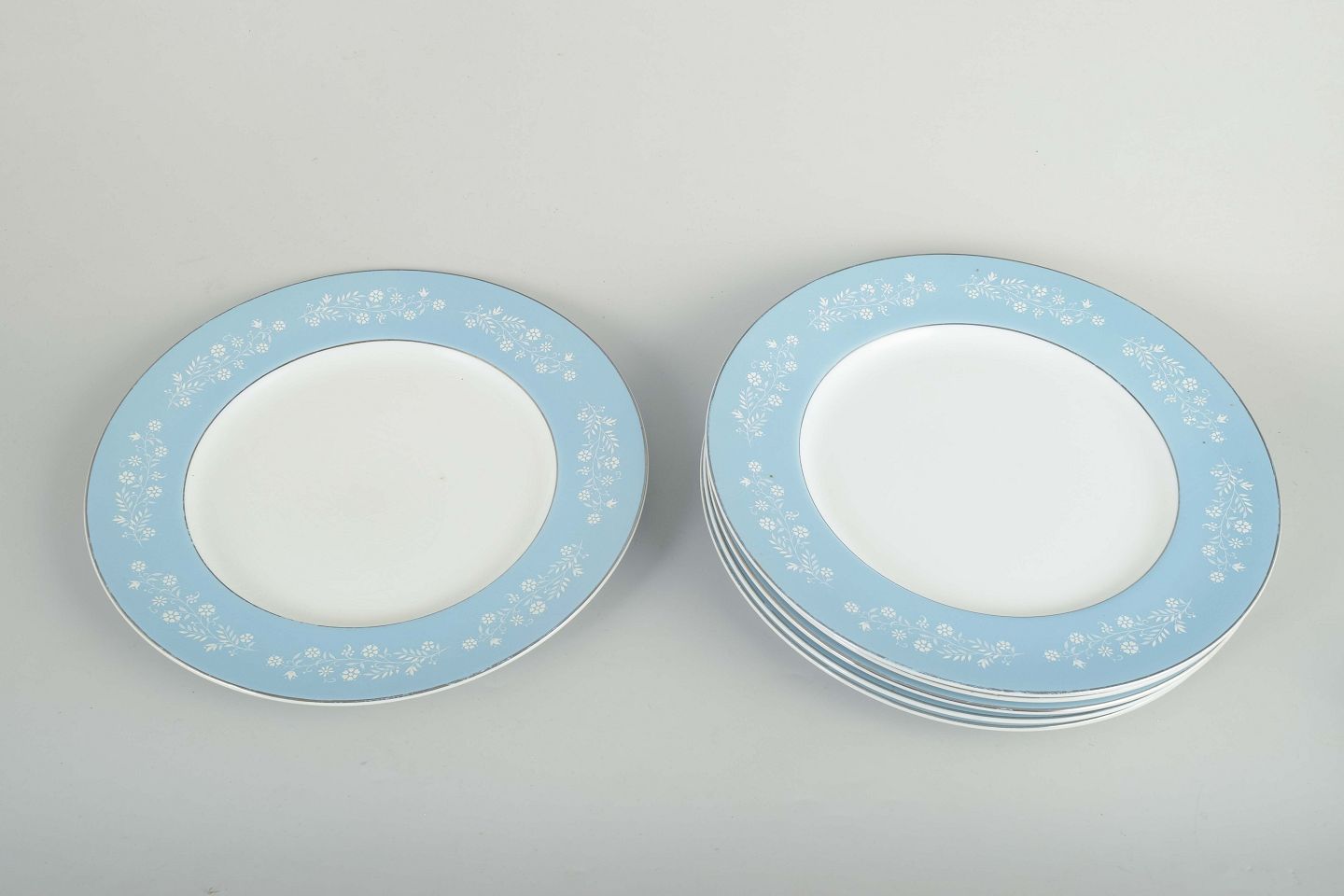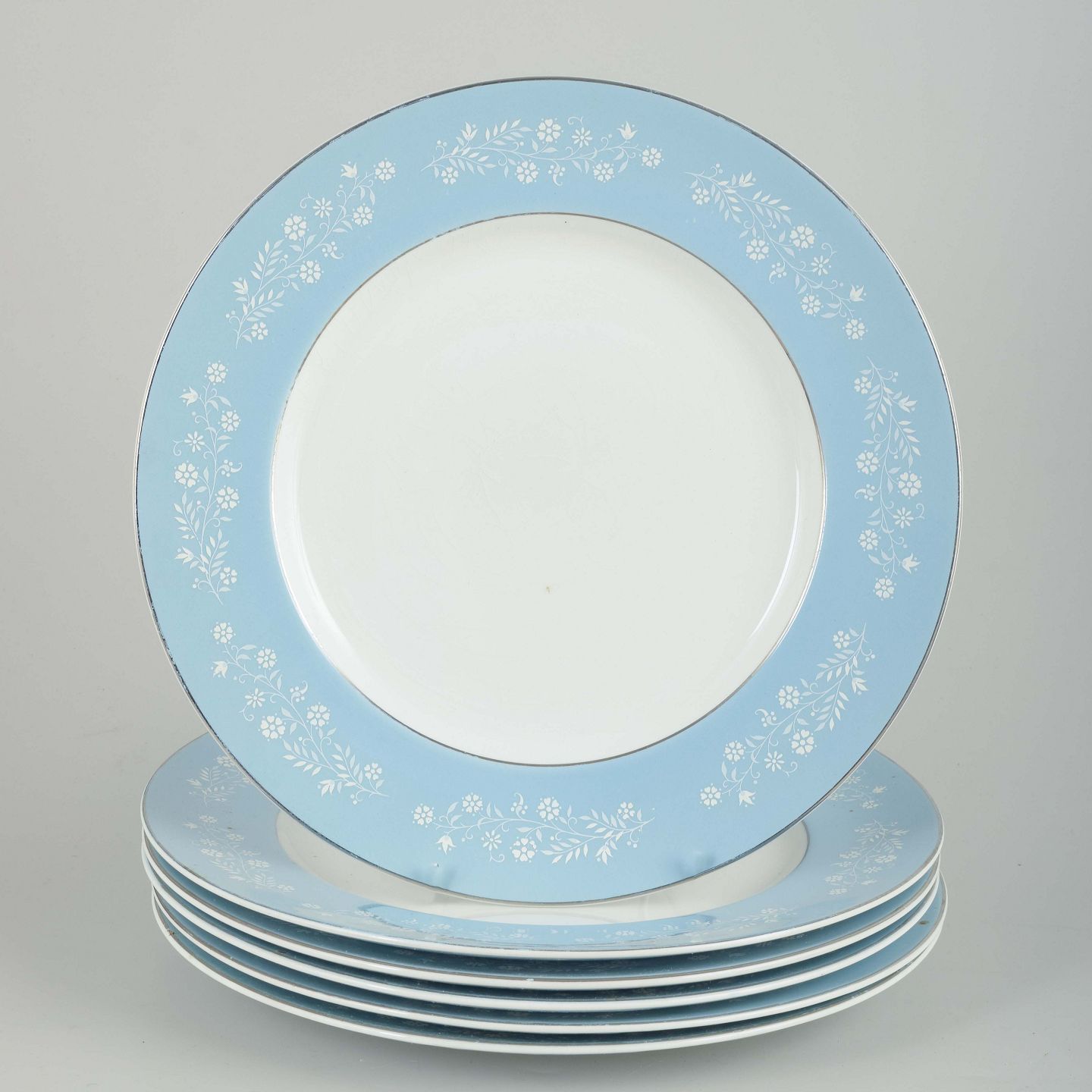 Set of six earthenware dinner plates with a blue border decorated with white flowers and a silver rim.
