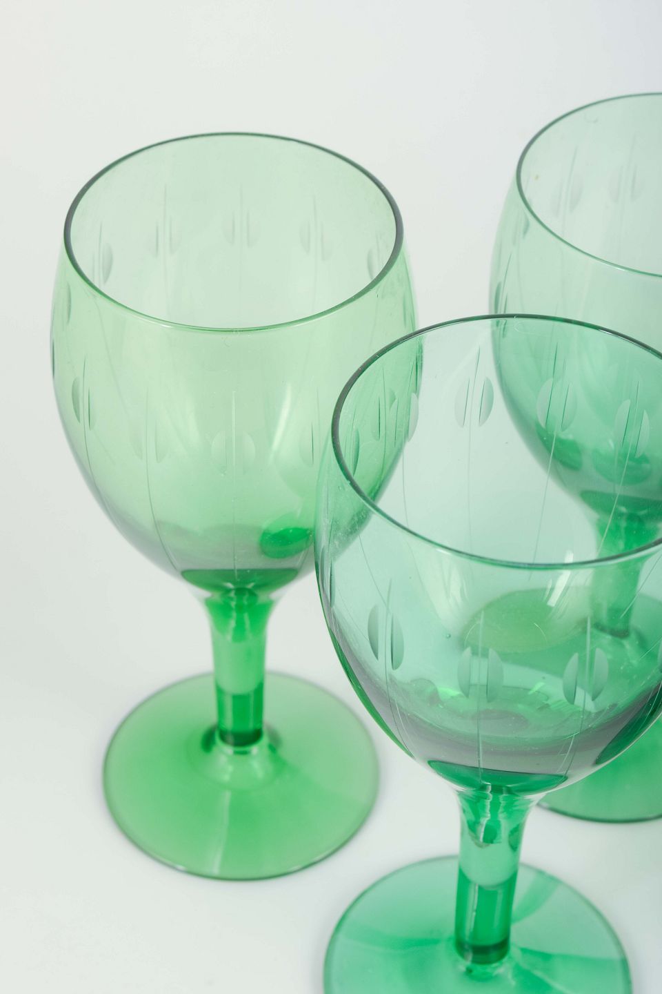 Set of six green white wine glasses in the classic Kirsten Piil design for Holmegaard. The glasses feature an elegant, slightly organic shape with a beautiful play of light in the transparent green glass – timeless and stylish.