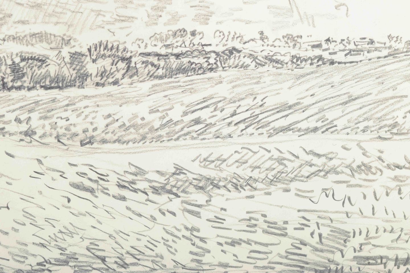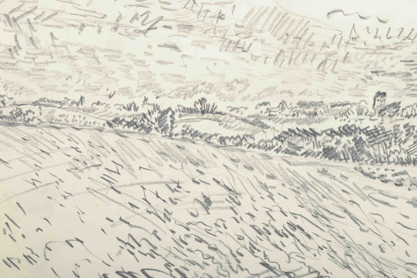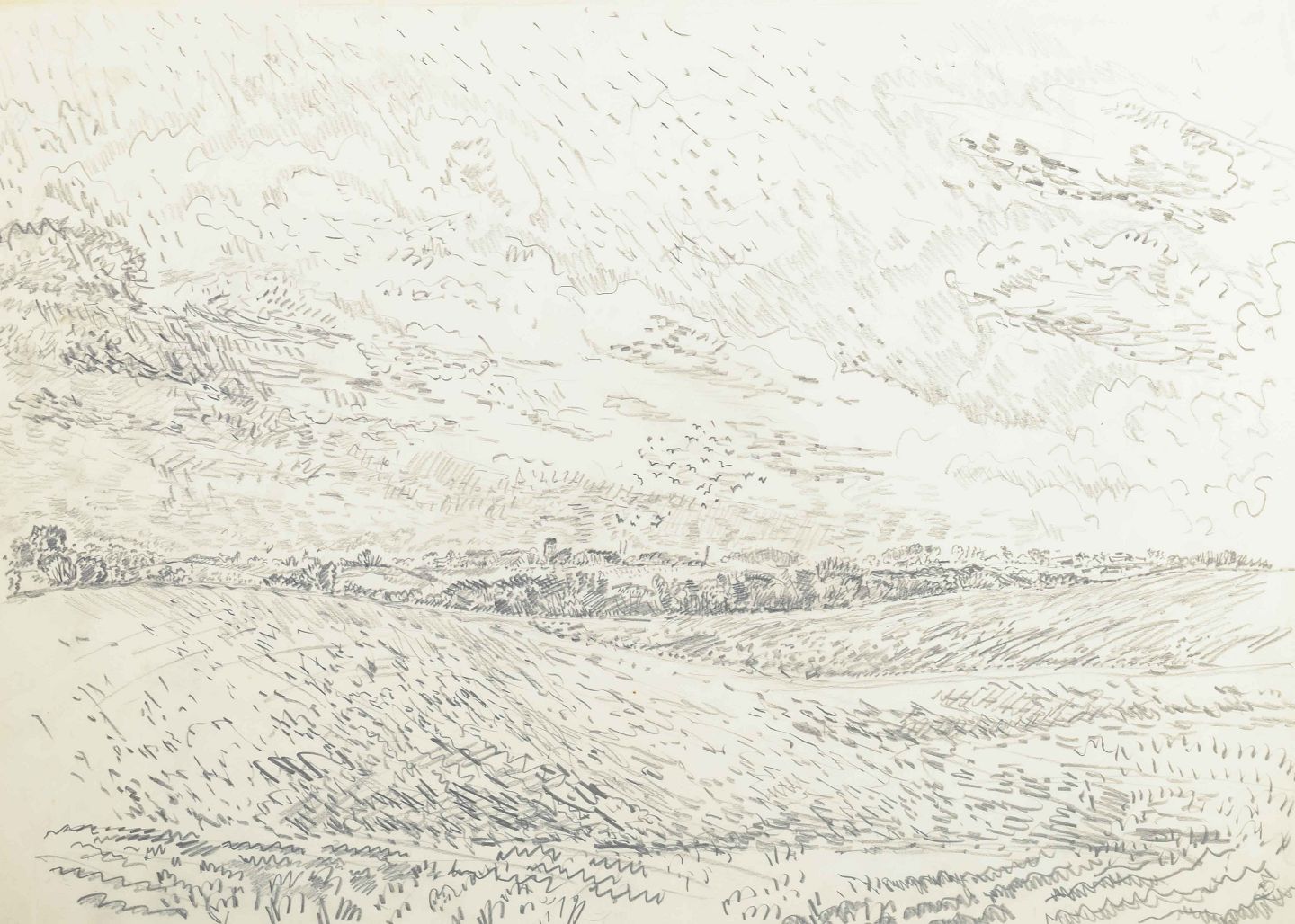 An atmospheric landscape executed in pencil, where the horizon and sky dominate the composition with calm, rhythmic strokes. The work captures the movement and atmosphere of nature with a simple yet vivid line technique.