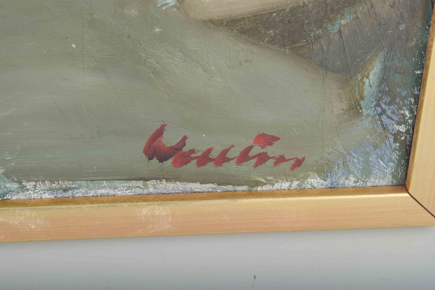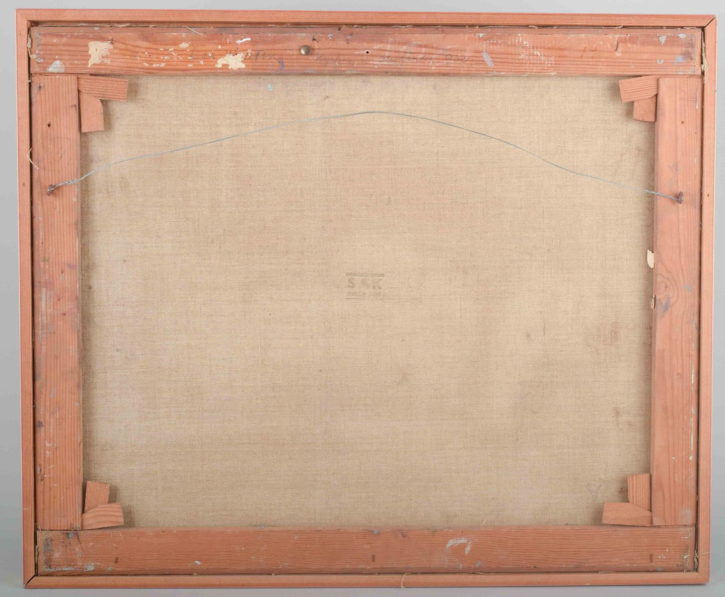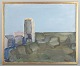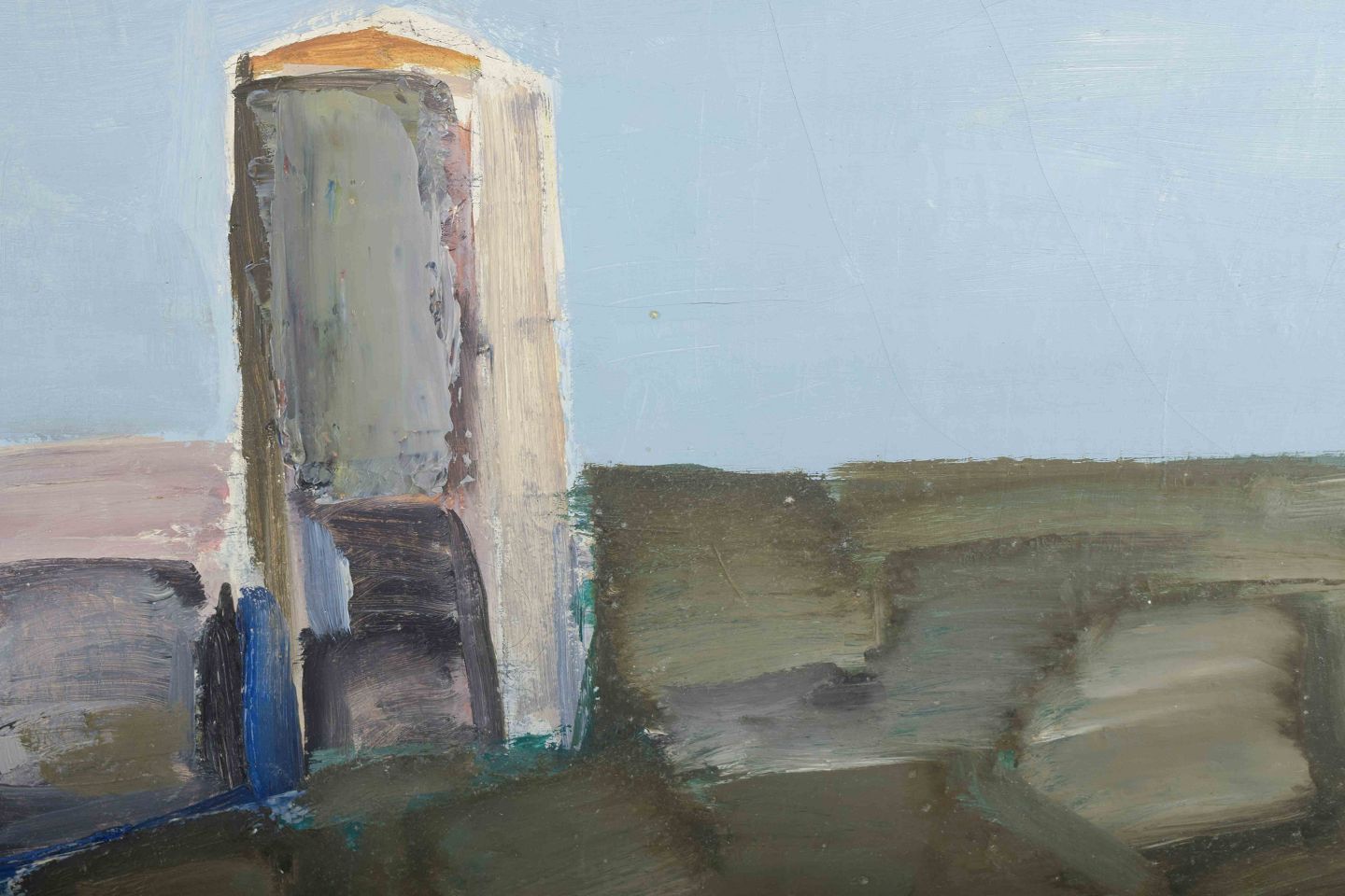 A modernist landscape painting with geometric-abstract forms and a monumental building placed centrally in the composition. The broad brushstrokes and muted colors emphasize the textural and architectural qualities of the work.