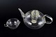 Bauhaus-inspired teapot with integrated strainer together with matching creamer. Produced in heat-resistant borosilicate glass (Jenaer Glas).