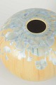 Thrown stoneware vase with crystalline glaze in shades of light blue and beige. The decoration forms an organic, almost floral pattern around the shoulder. Signed in monogram on the base.