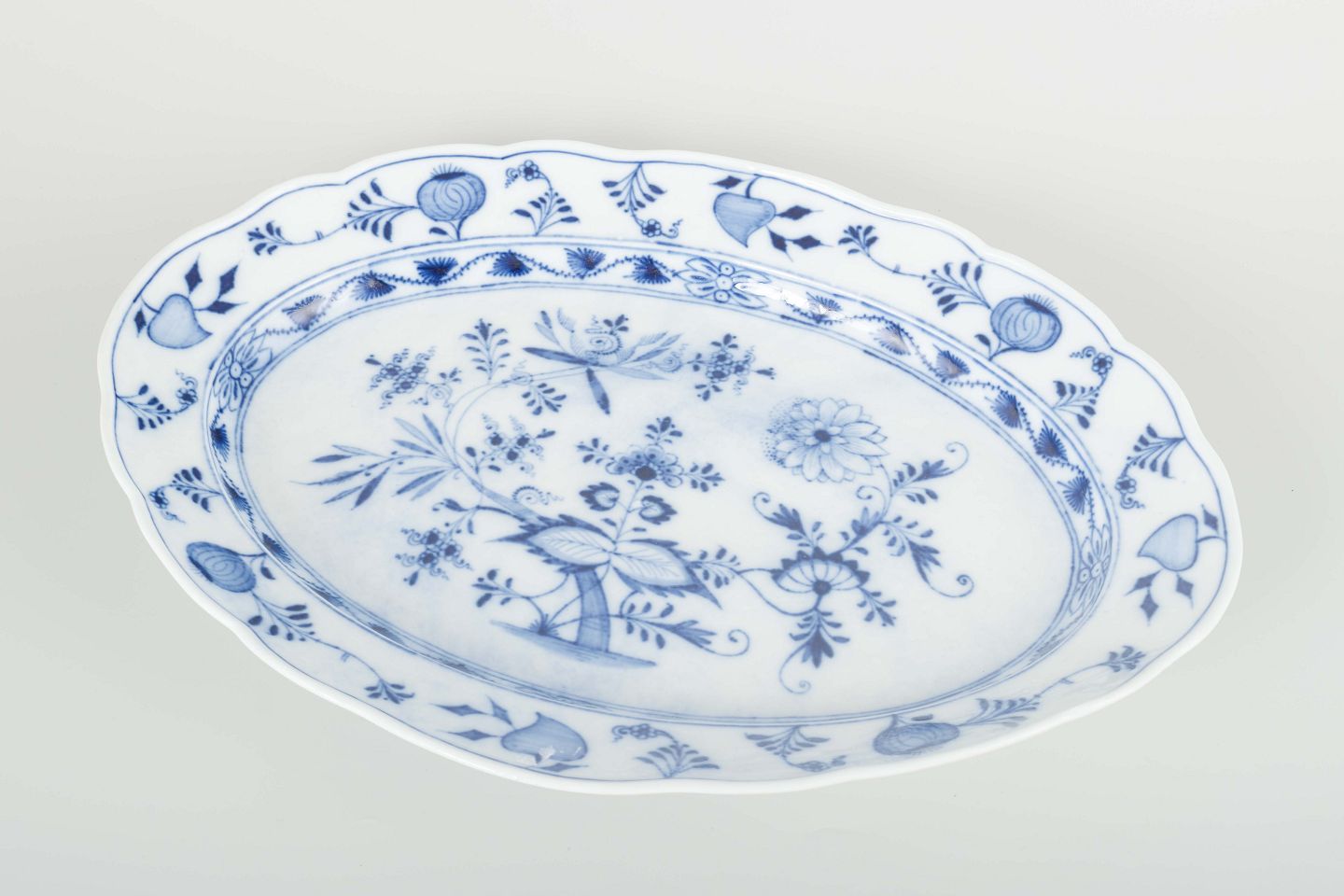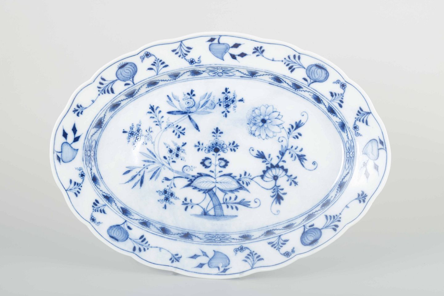 Elegant oval porcelain serving platter, hand-painted in the classic “Blue Onion” (Zwiebelmuster) pattern in cobalt blue. Decorated with stylized flowers, fruits and onion motifs – an iconic Meissen design since the 18th century.