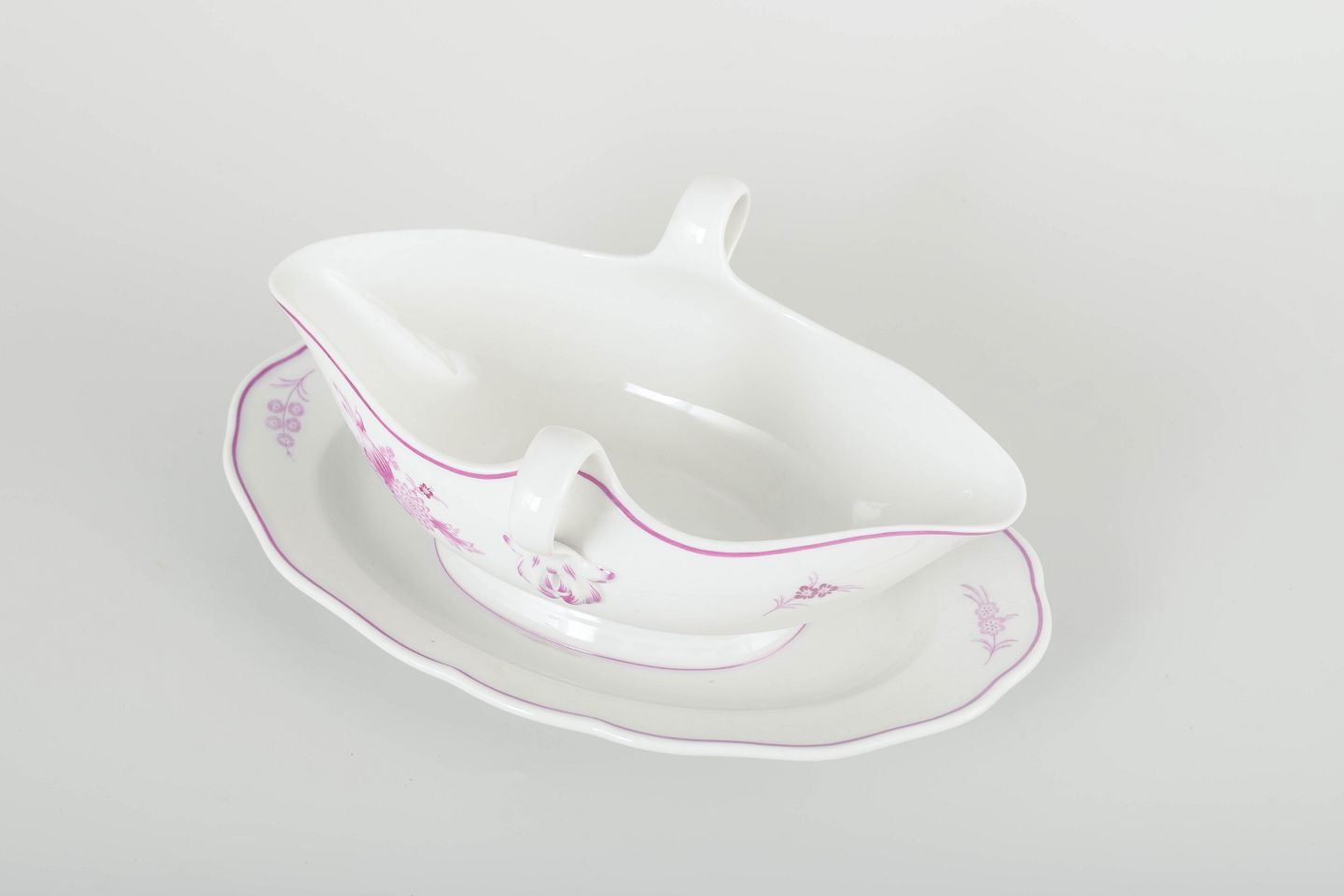 Hand-painted porcelain sauce boat with fixed tray and double spout, decorated with lilac floral compositions and elegant pink edging. A classic Meissen design combining refined craftsmanship with functional elegance.