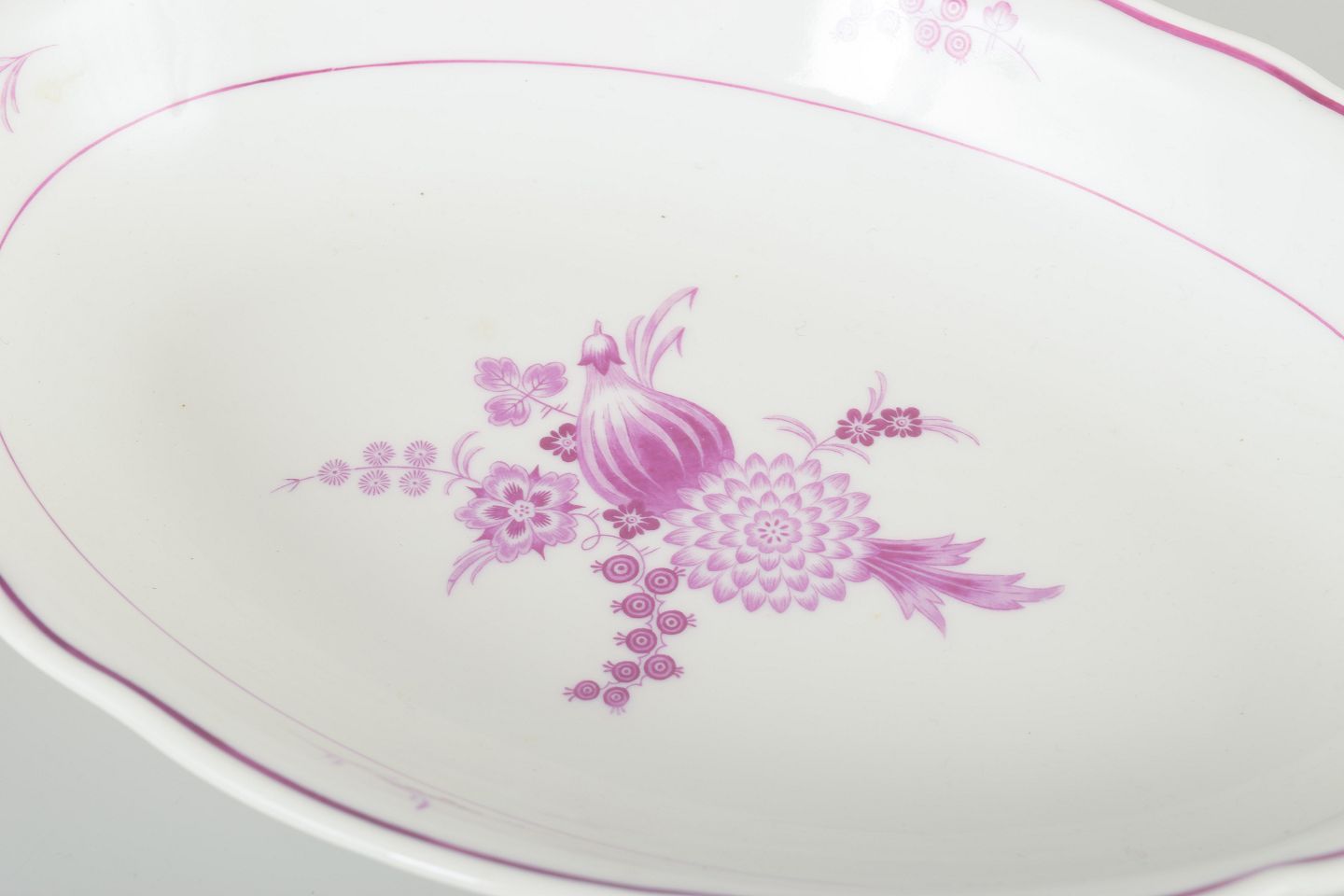 Hand-painted oval porcelain bowl decorated with lilac floral compositions and a gently scalloped rim. Classic Meissen design with fine pink-lilac detailing.
