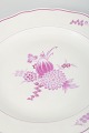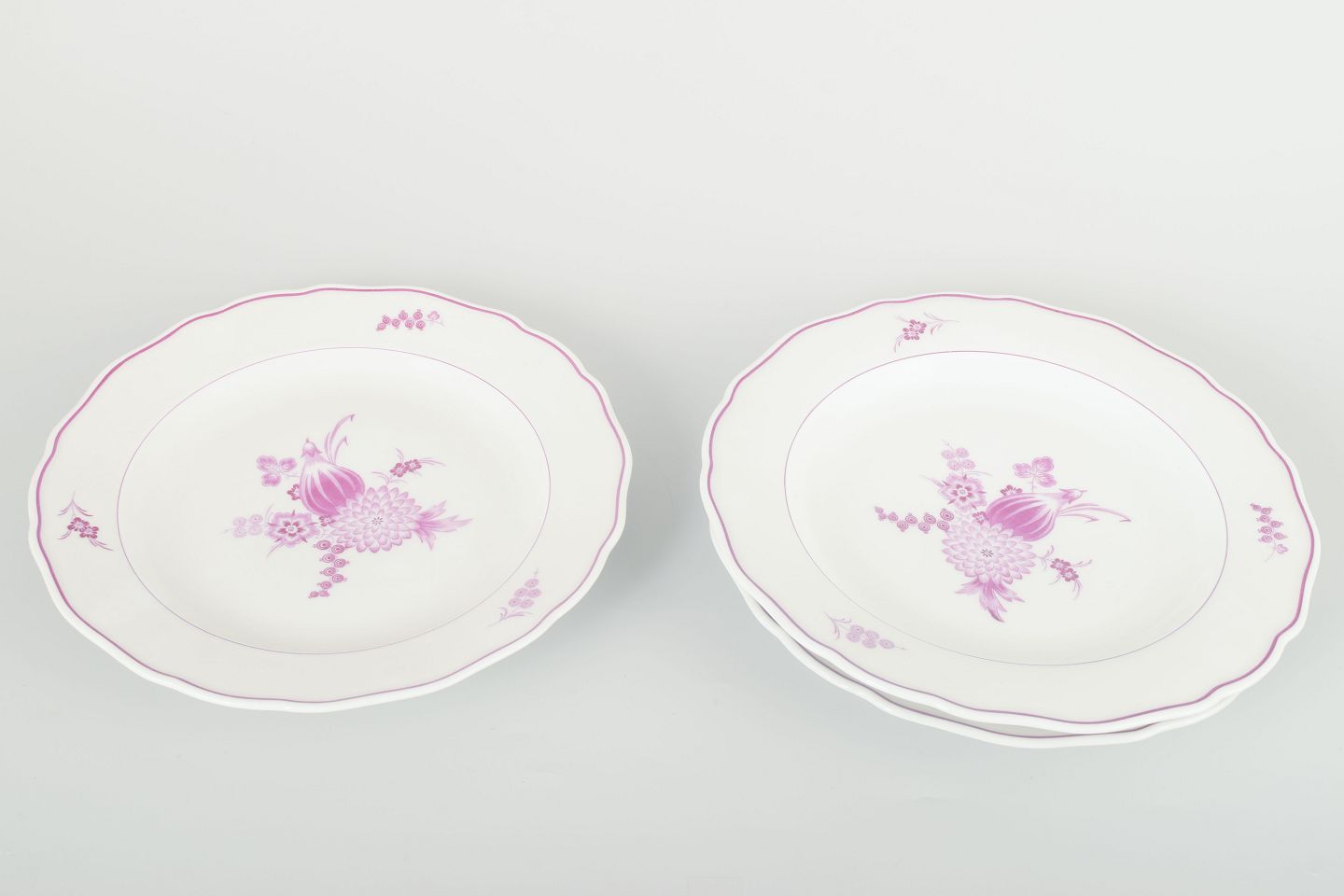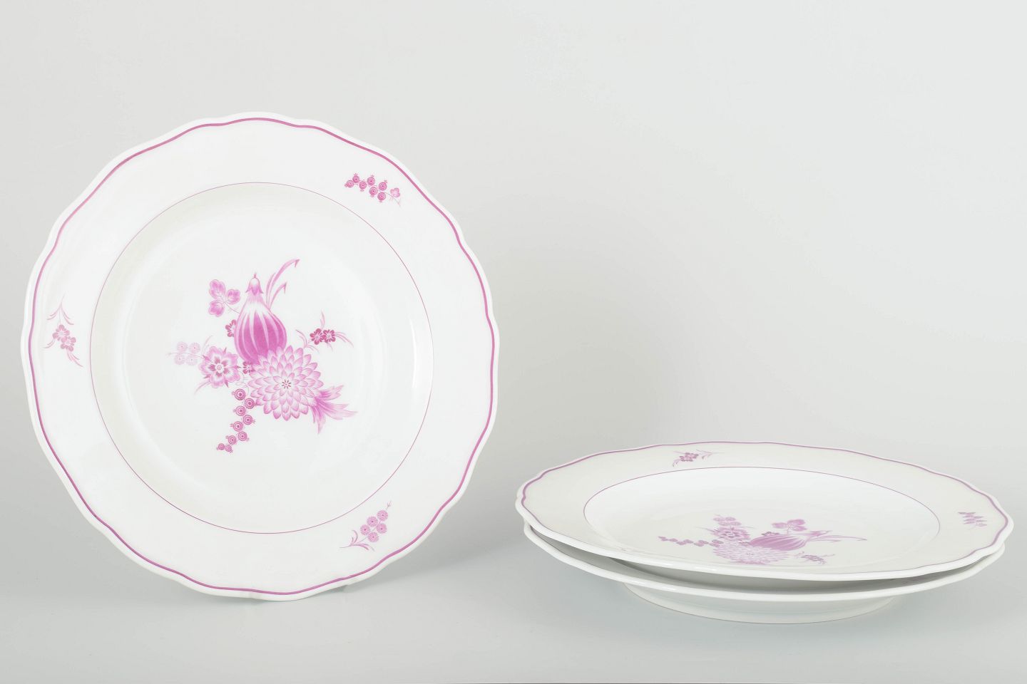 Set of three hand-painted porcelain dinner plates decorated with lilac floral compositions and a gently scalloped rim. Typical of Meissen’s refined models with delicate pink-lilac detailing.
