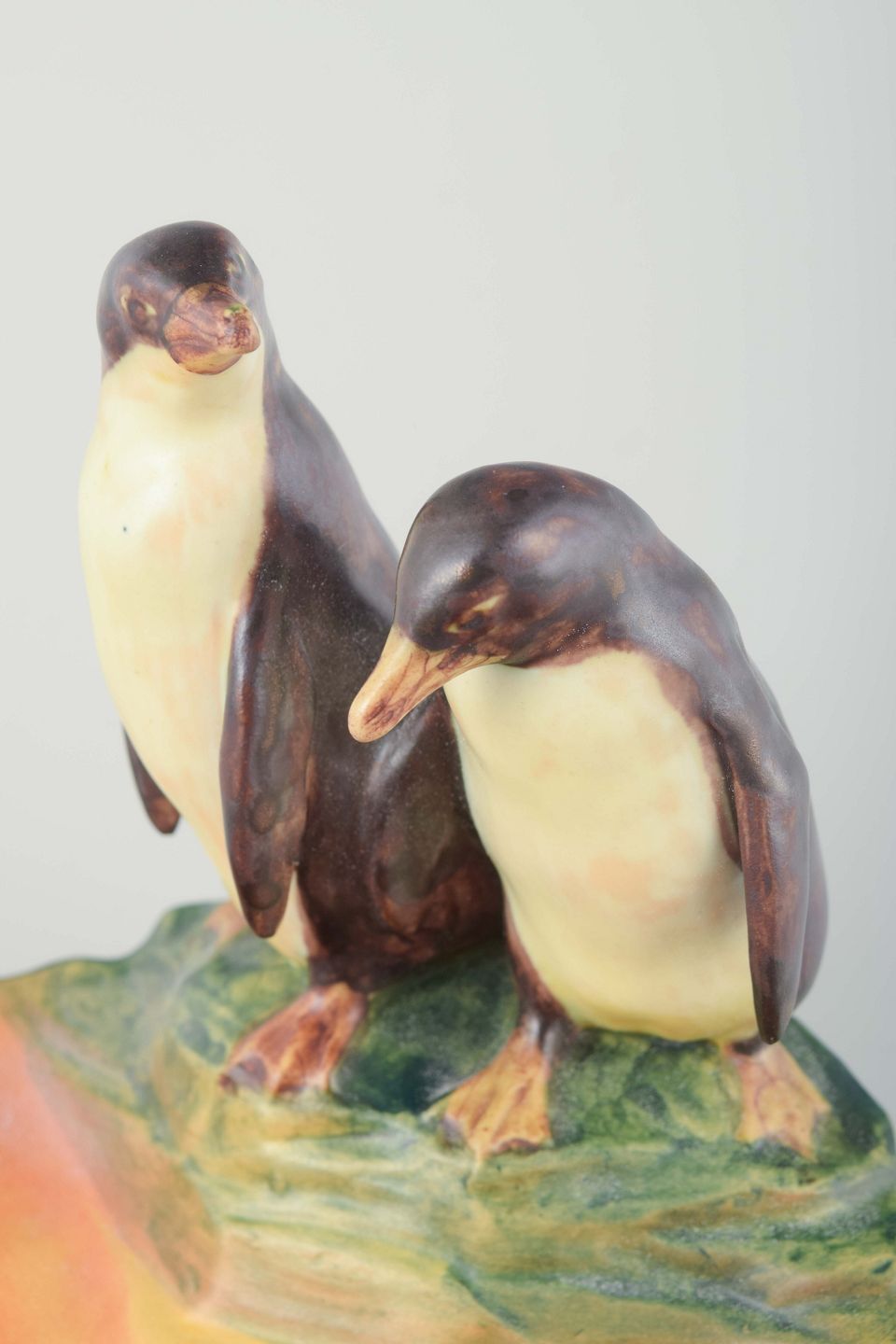 Decorative bowl featuring two penguins standing on the rim. Glazed in shades of green, brown, and cream with a naturalistic surface texture. A rare figurative work from Ipsens Enke, 1920s.