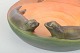 Decorative bowl featuring three seals – two reclining and one seated on the rim. Glazed in shades of green and brown with a naturalistic surface texture. A classic figurative work from Ipsens Enke, 1920s.