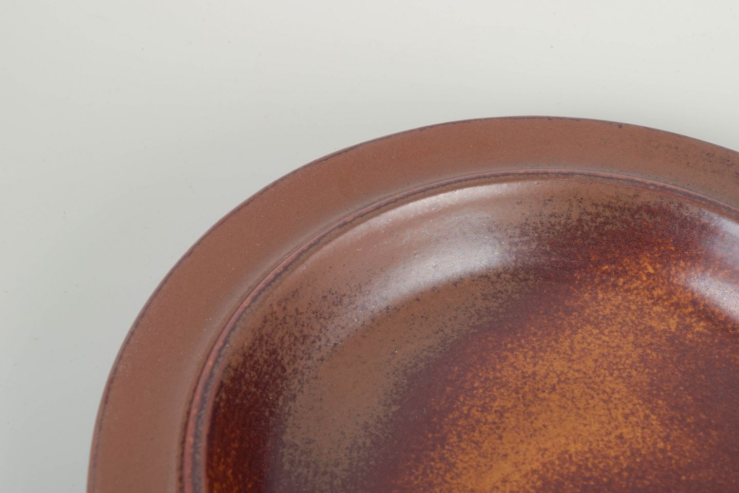 Softly rounded oval form coated in the warm brown Ruska glaze with lively tonal variations and characteristic speckled surface.