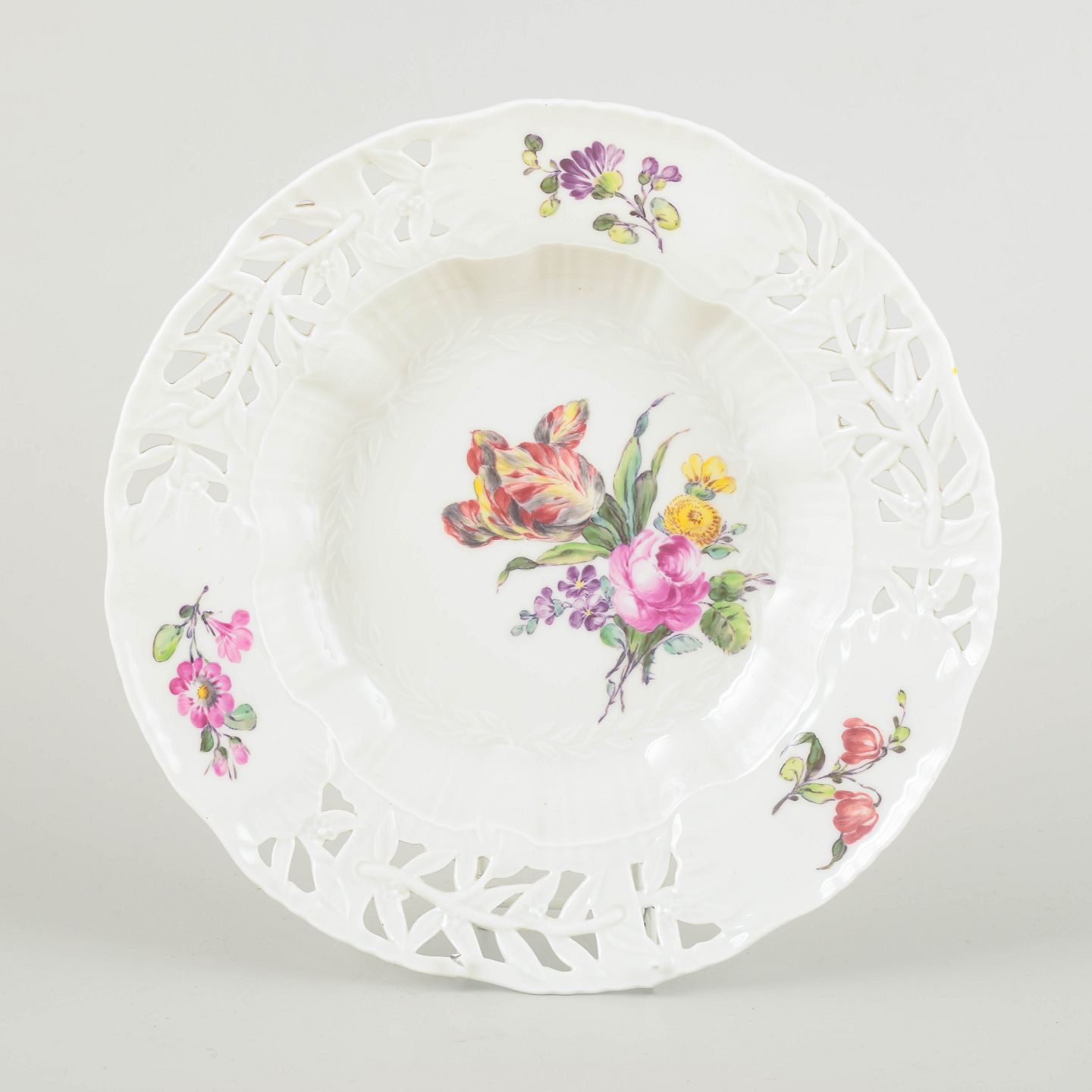 Hand-painted porcelain with floral motif in multicoloured palette and openwork rim in classic style. Elegant deep form with richly decorated centre and refined craftsmanship.