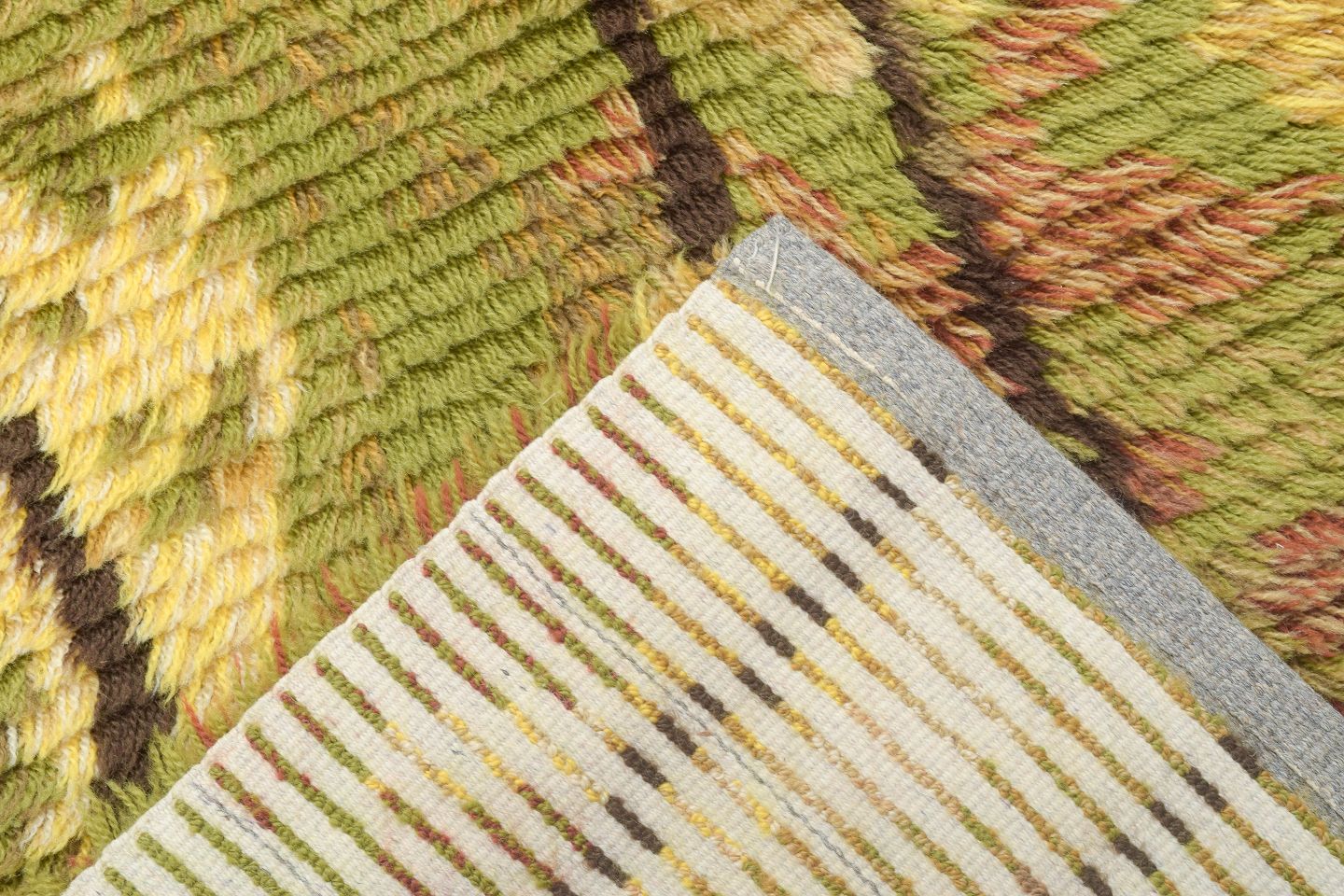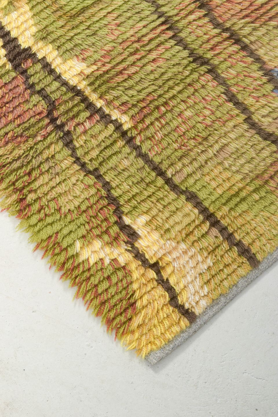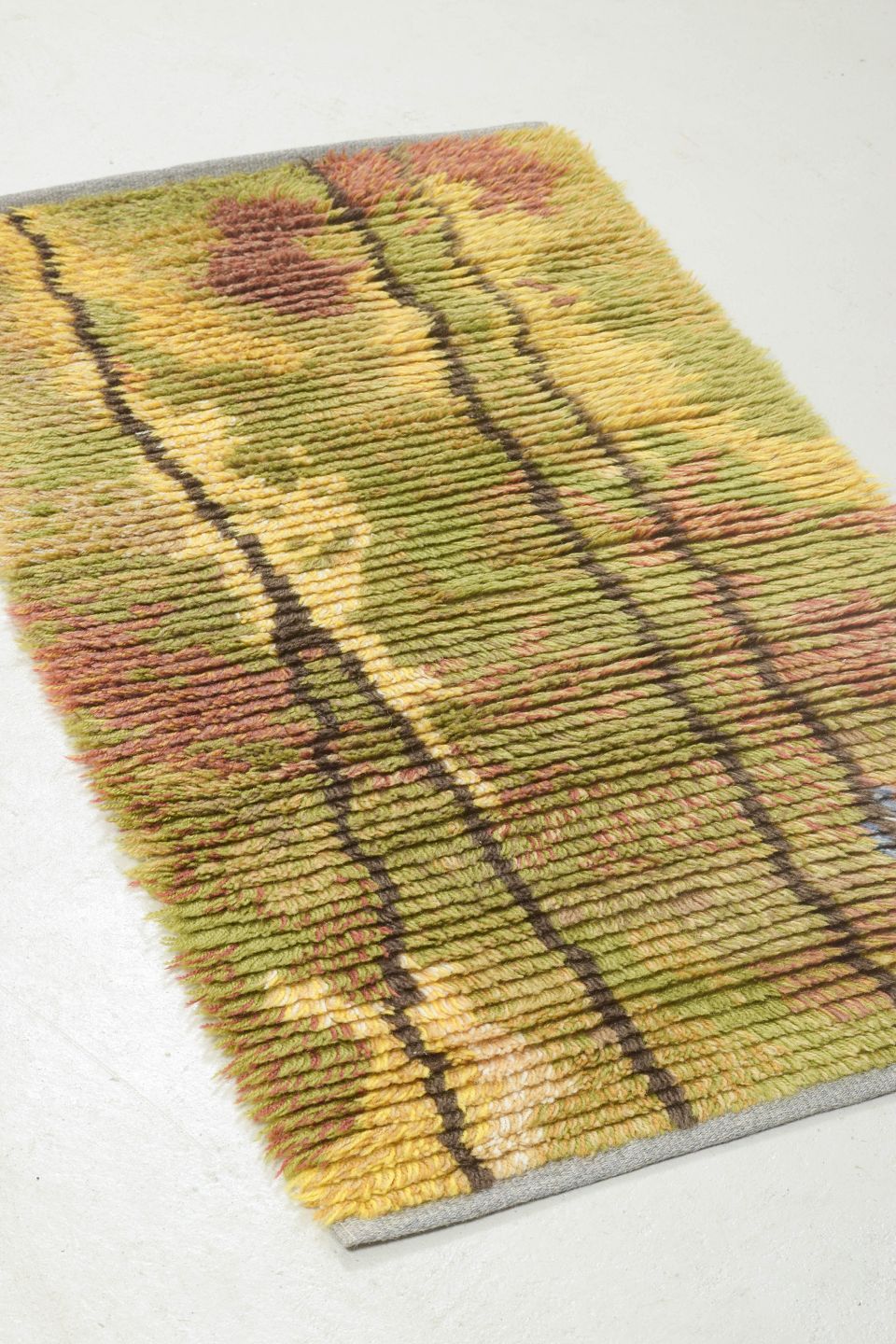 Hand-knotted rya carpet in pure wool with an abstract pattern in shades of green, yellow, brown, and cream. A decorative textile with distinctive texture and colour play, characteristic of Scandinavian design from the period.