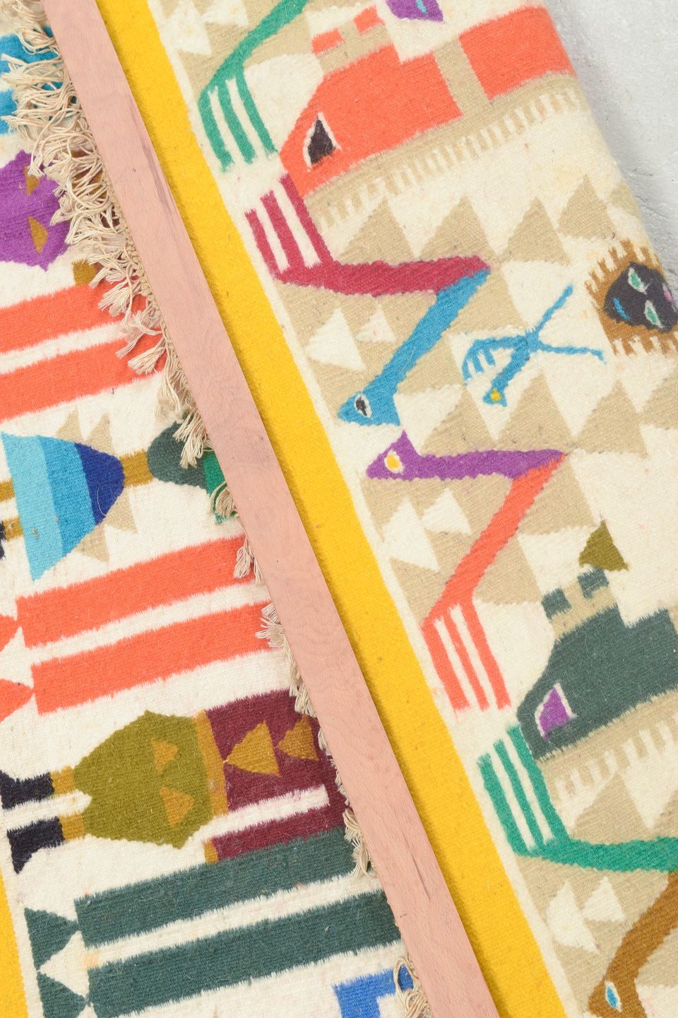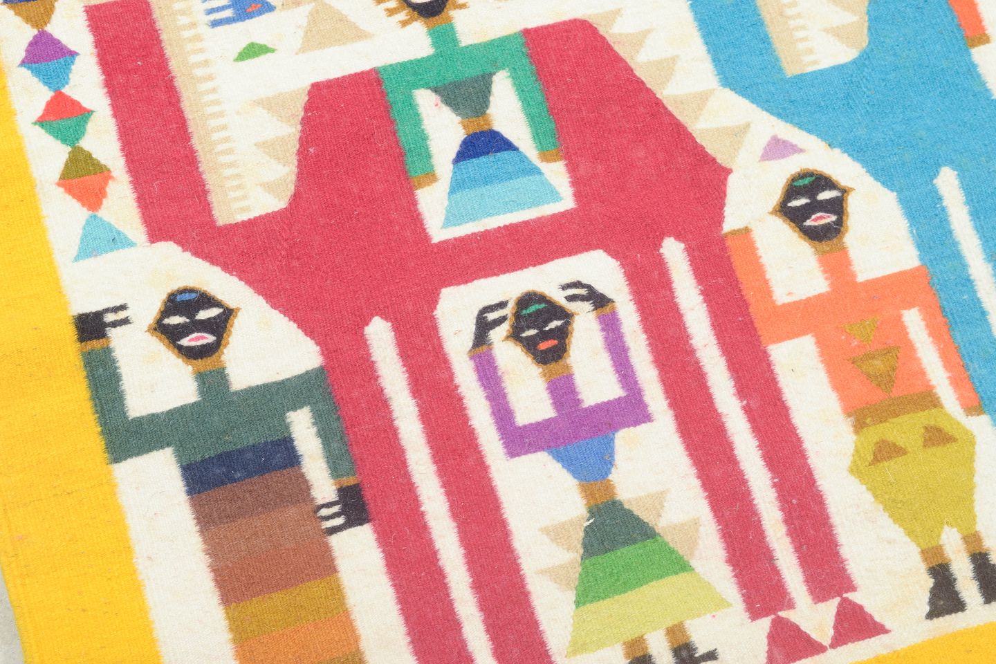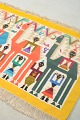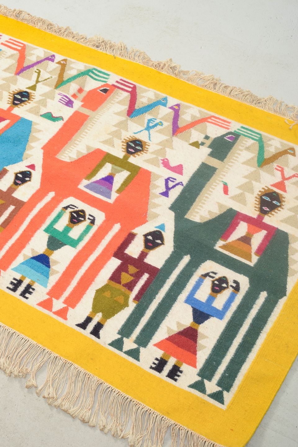 Handwoven rölakan wall rug in wool featuring a vibrant, figurative design in bold tones of yellow, blue, red, green, and purple on a mustard background. A distinctive example of 1970s Swedish weaving, where the traditional rölakan technique was reimagined as a decorative and artistic medium.