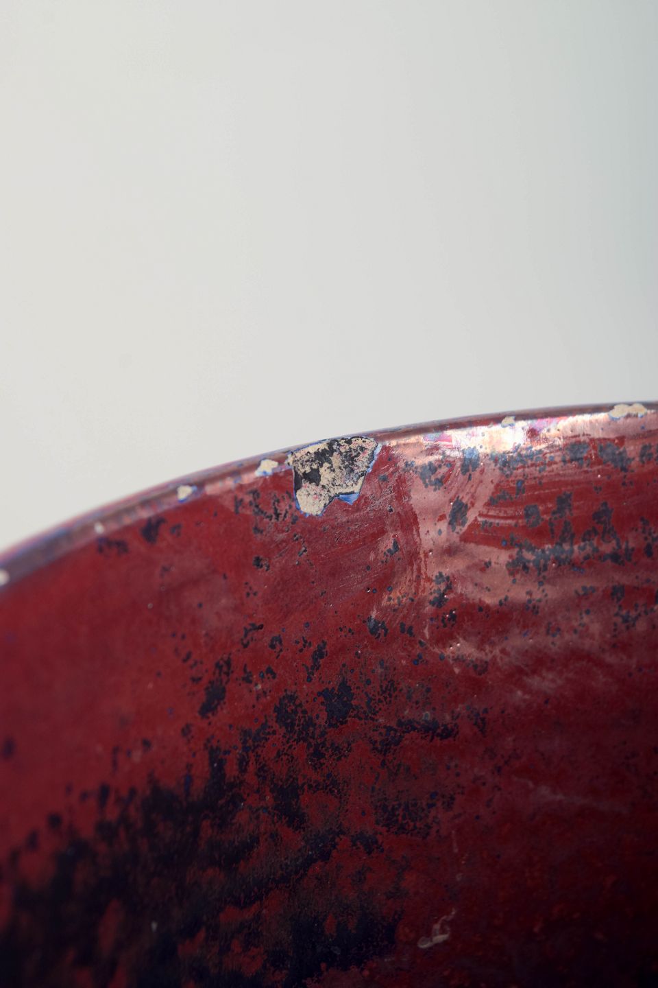 Impressive tall ceramic vase with a strong iridescent glaze in blue, silver and red tones. The faceted, geometric architecture is typical of Starck’s celebrated work for Michael Andersen on the island of Bornholm.