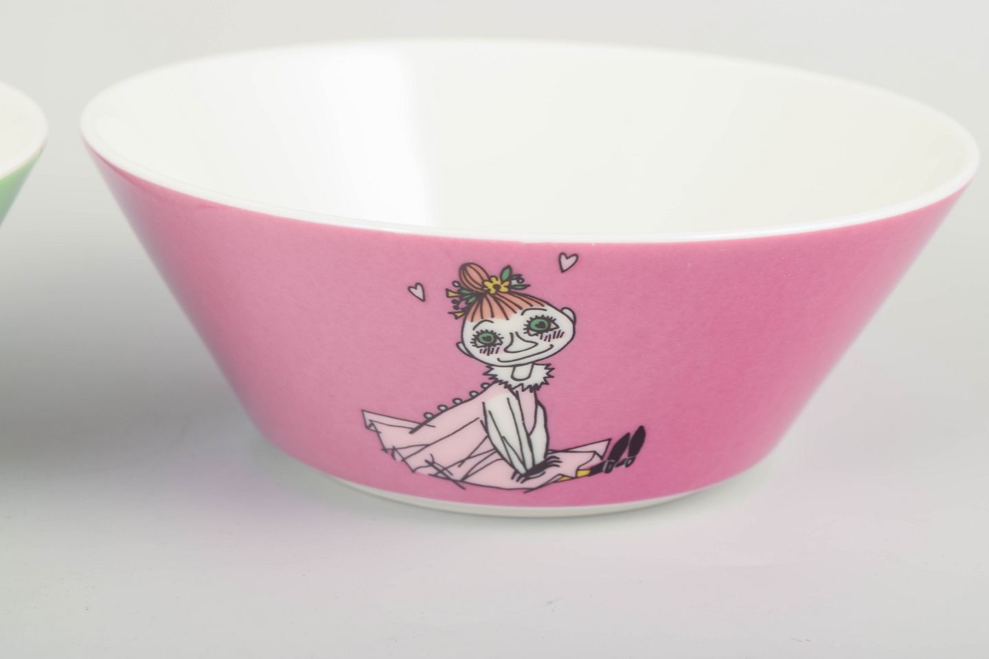 Two decorative porcelain Moomin bowls by Arabia Finland, each featuring iconic characters from Tove Jansson’s universe.