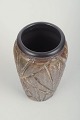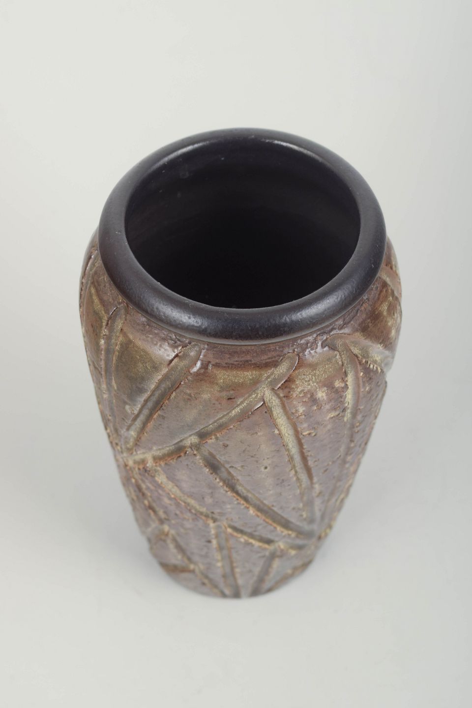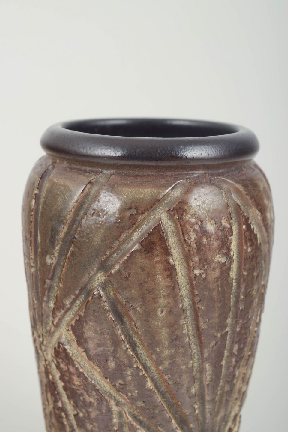 Relief-decorated stoneware vase with pronounced incised leaf and linear pattern and dark glazed rim. Model 3063A.