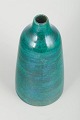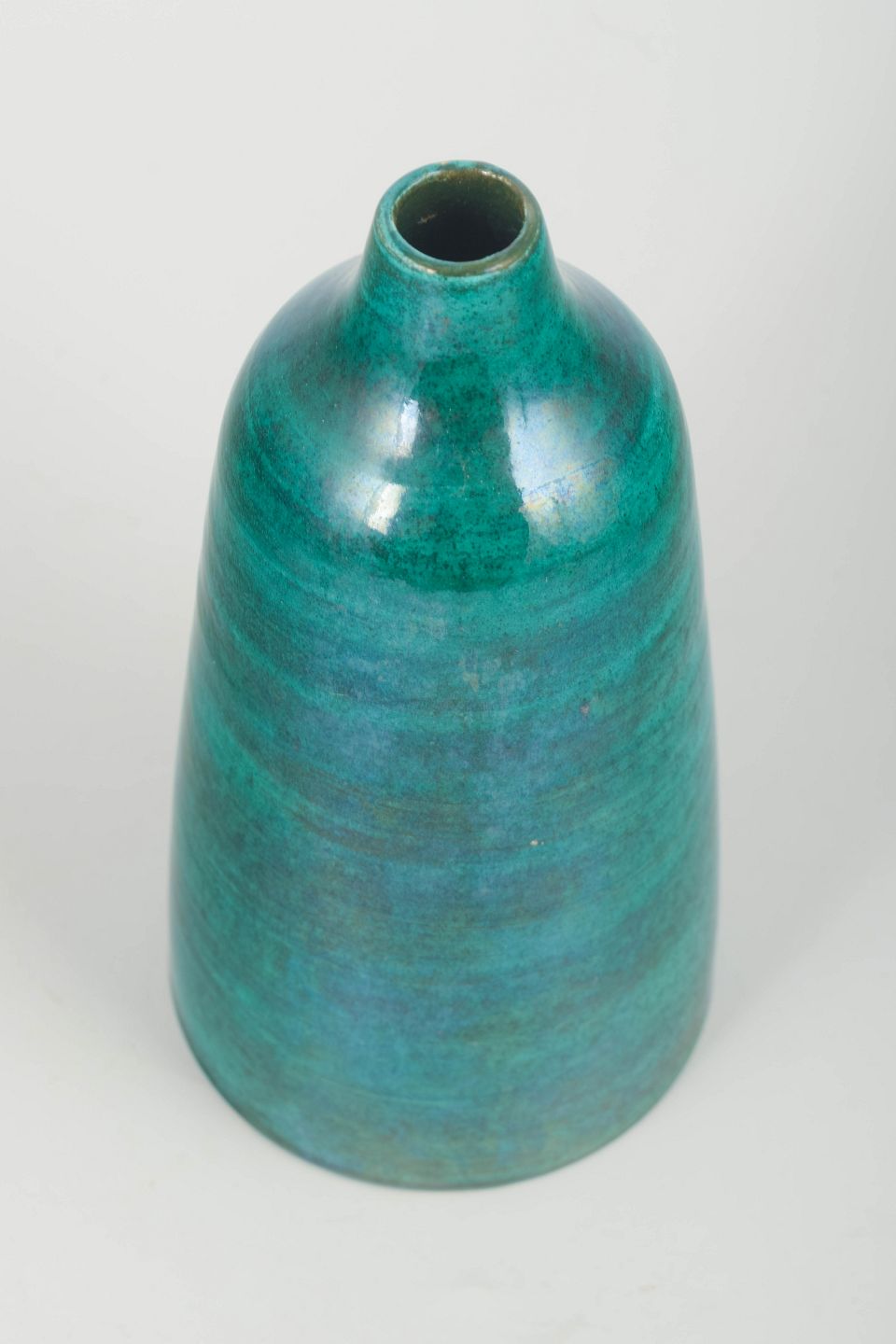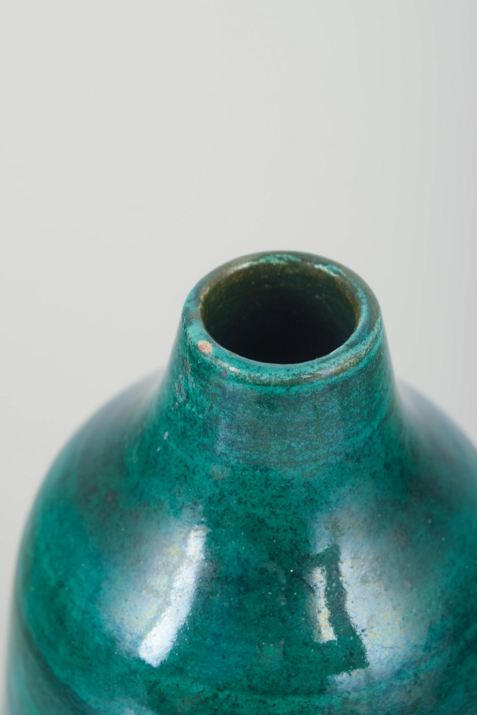 Wheel-thrown stoneware vase with a narrow neck and deep emerald green glaze with vivid tonal variation. A classic example of studio ceramics from the period, emphasising form and surface.