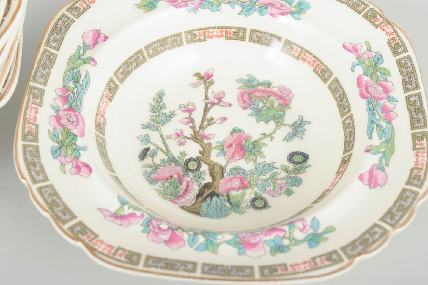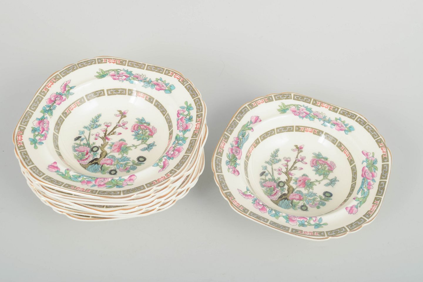 Faience deep plates with decorative oriental motif in multicoloured transfer, typical of English production inspired by Chinese porcelain.