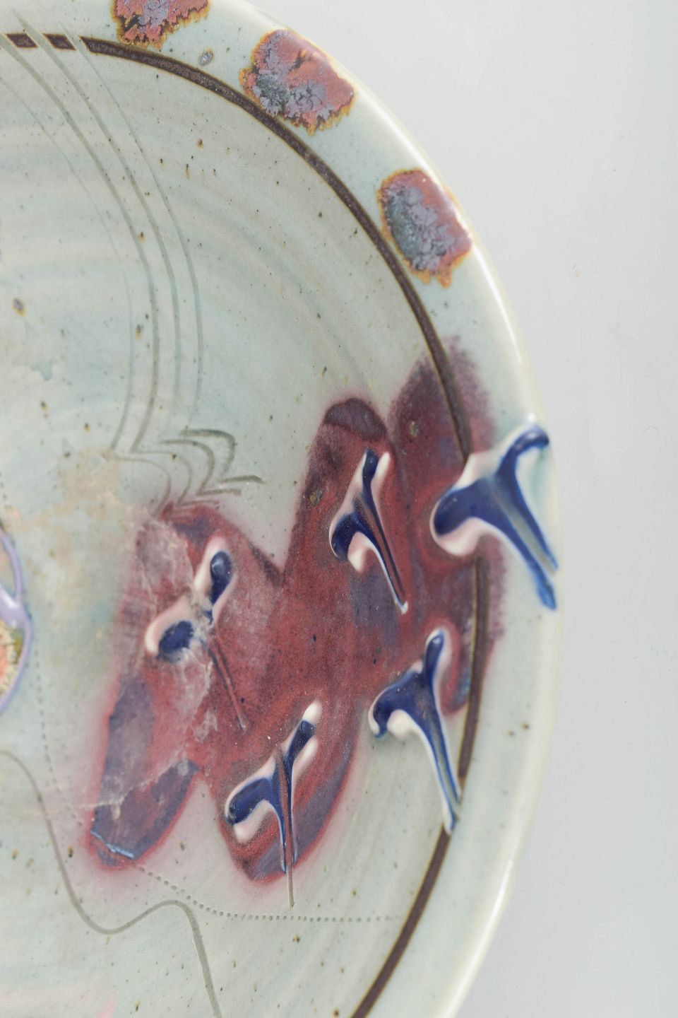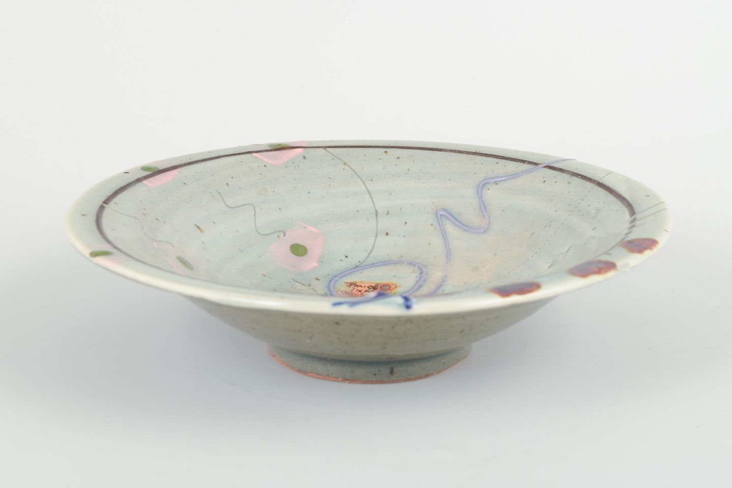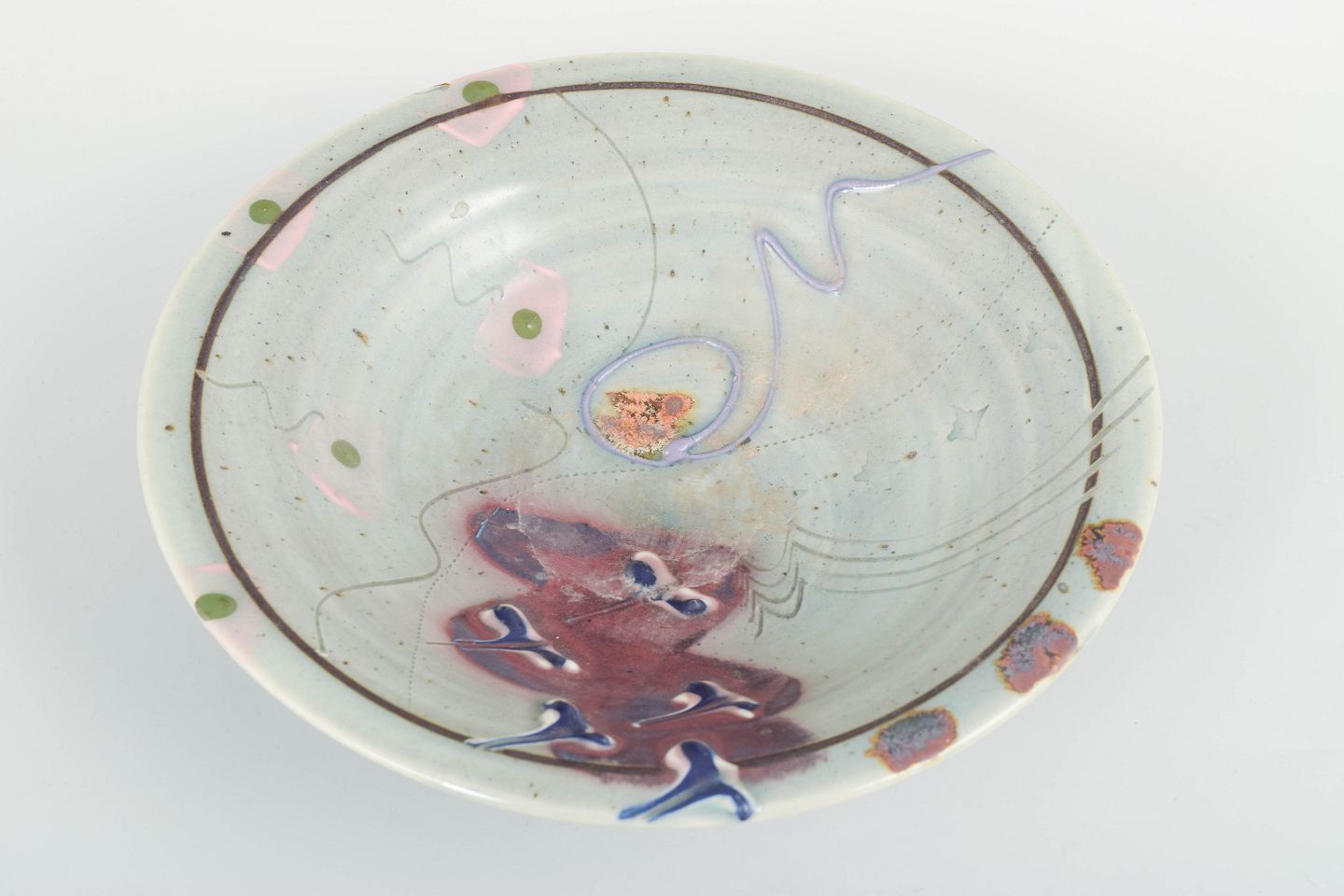 Unique bowl in Chinese-inspired style with decorative brush and relief elements, featuring a light celadon-style glaze with coloured accents. Signed.