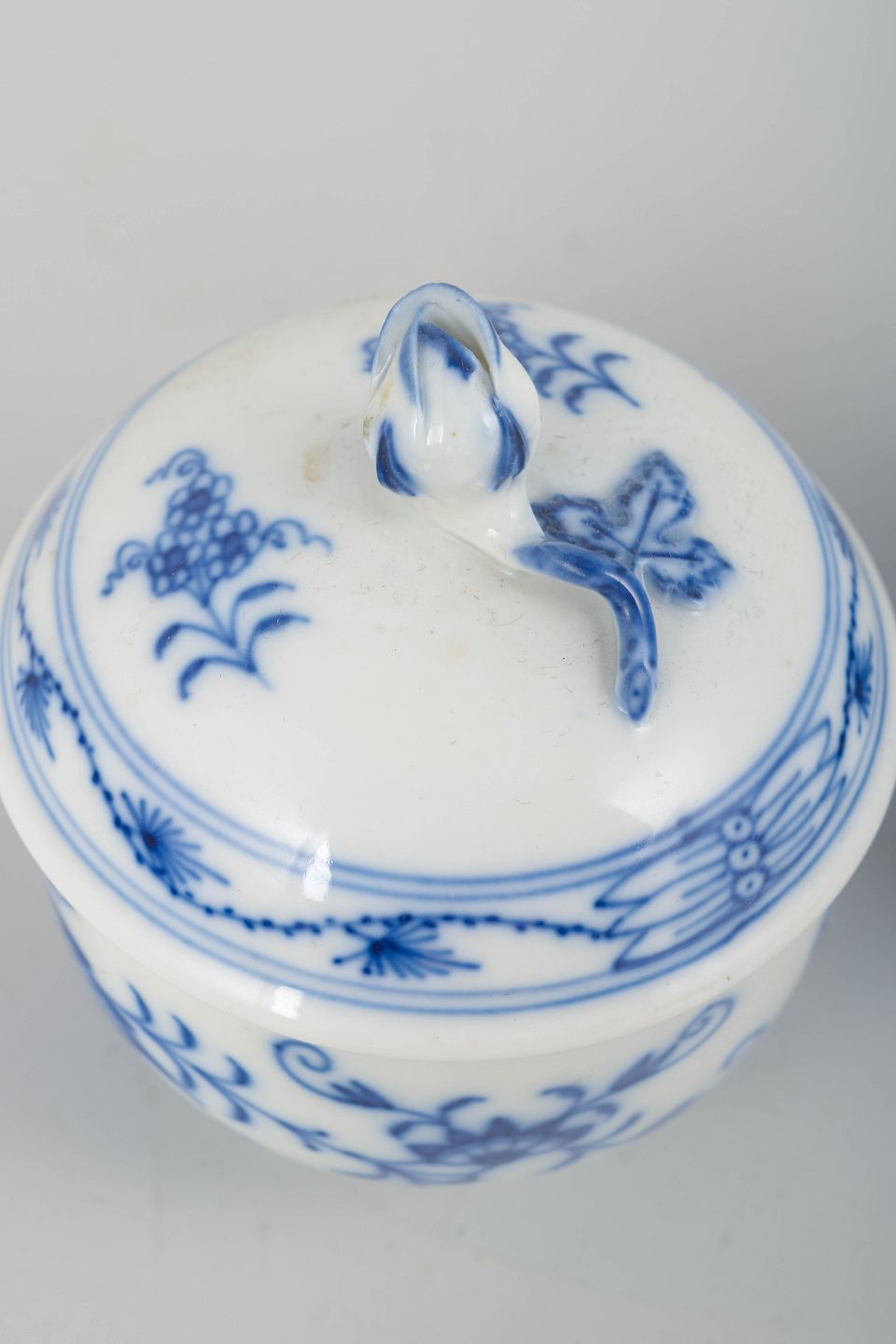 A charming set consisting of a classic lidded sugar bowl and a cream jug in the iconic Blue Onion pattern (Zwiebelmuster). Both pieces are hand-painted in cobalt blue underglaze and made in the elegant forms characteristic of Meissen’s early 20th-century production.