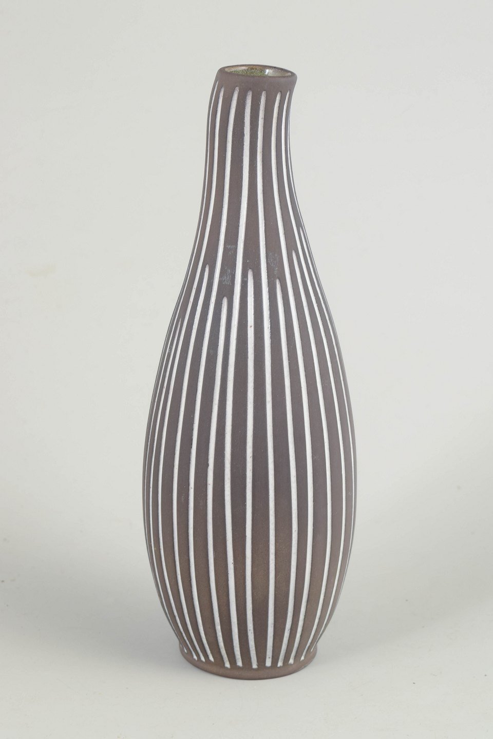 Slender, elongated stoneware vase with characteristic hand-painted white striped décor on a dark brown body. An elegant example of Nordic modernist design.