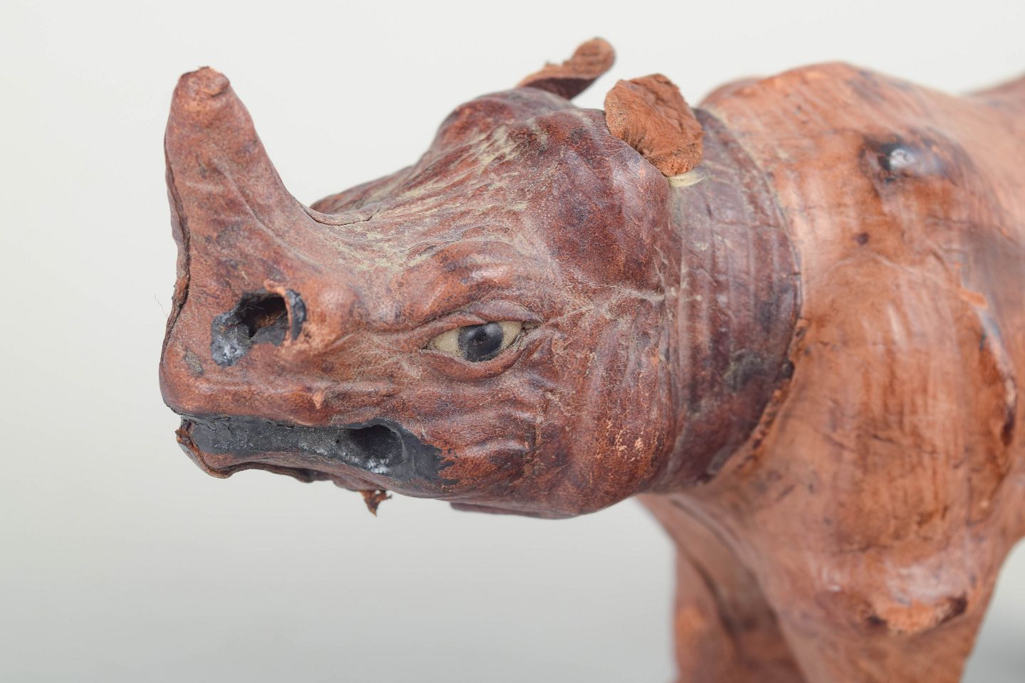 Handmade rhinoceros figure crafted in shaped and stitched leather, possibly retailed by Liberty & Co., London. Features finely modelled details, carved eyes and a warm patinated surface.