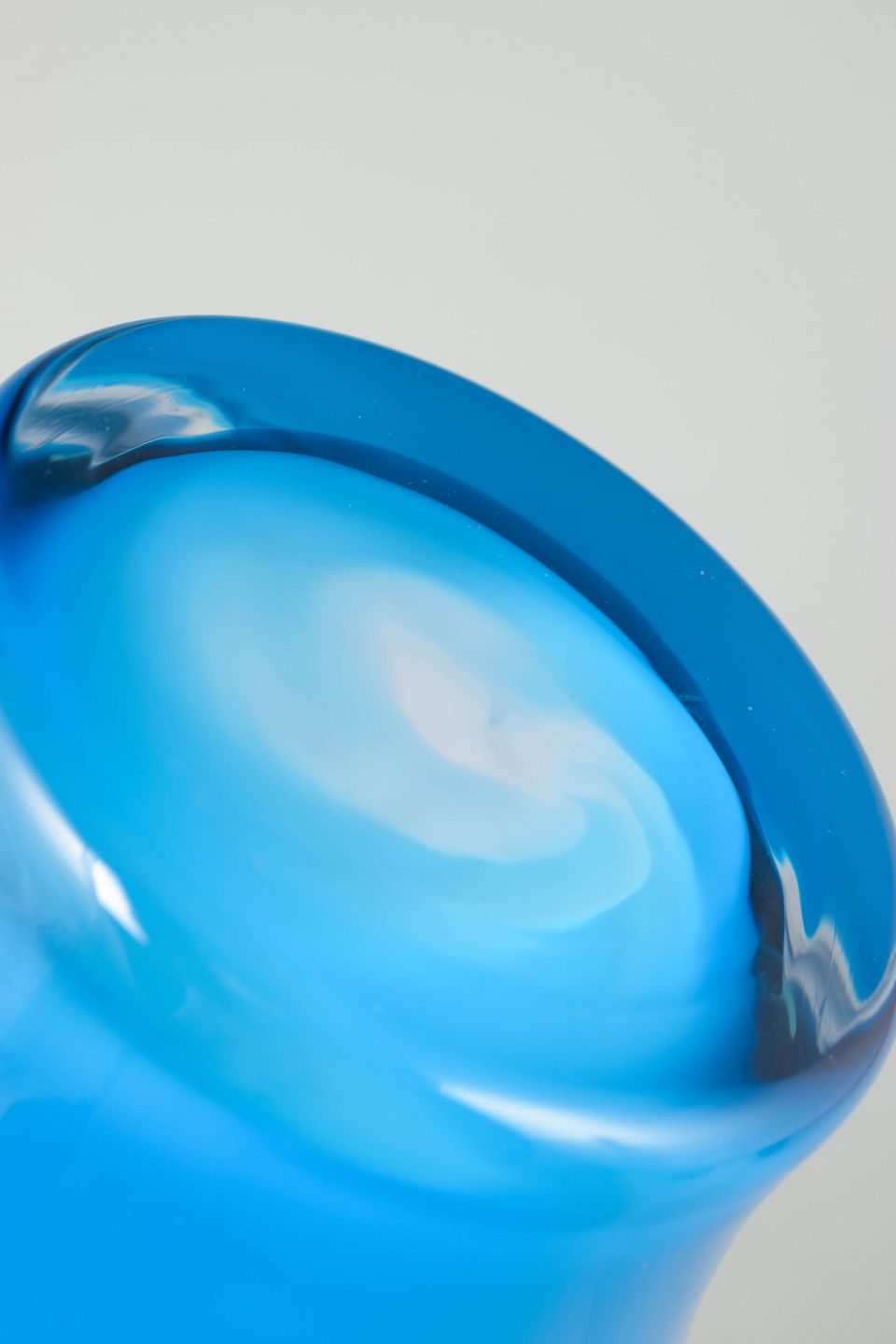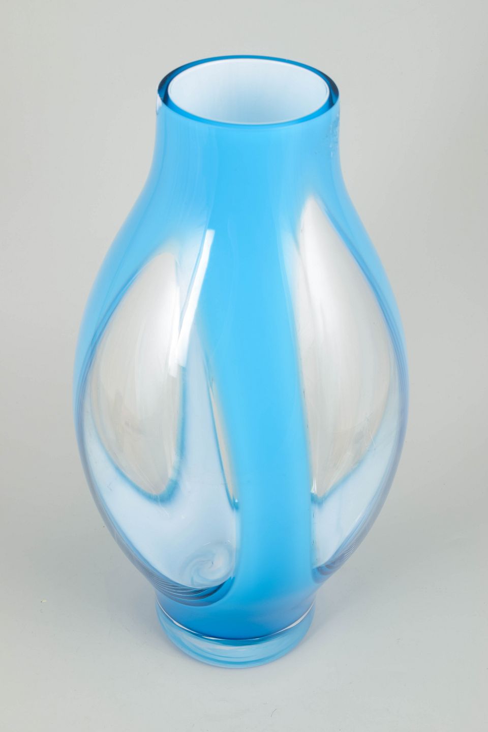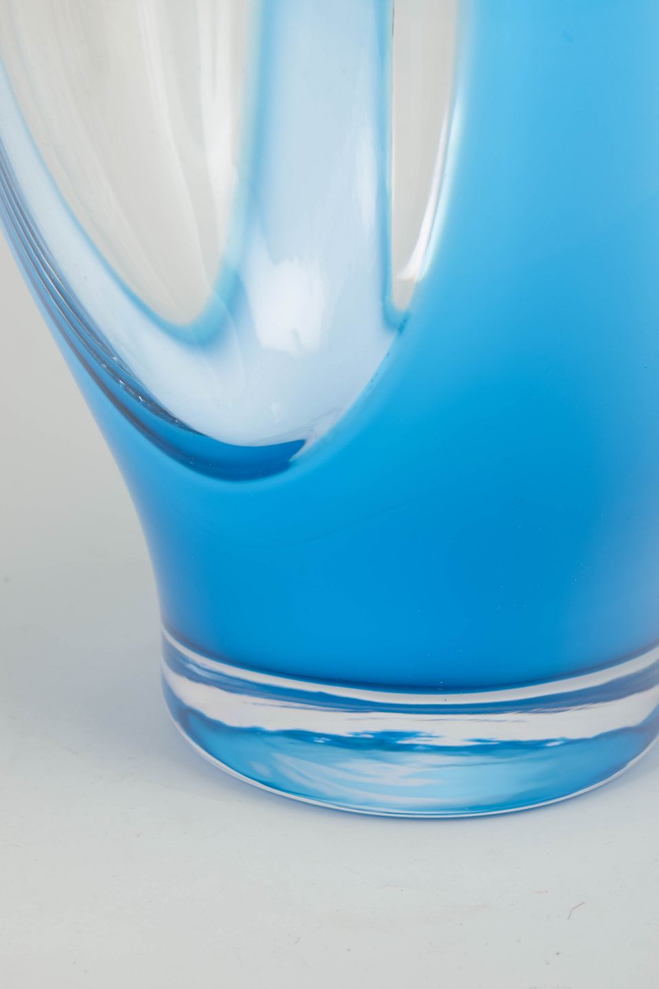 Impressive sculptural art-glass vase, executed in thick layered glass with a striking optical effect. The elegant, organic silhouette combined with the clear and blue-tinted glass mass gives the piece a strong modern expression.