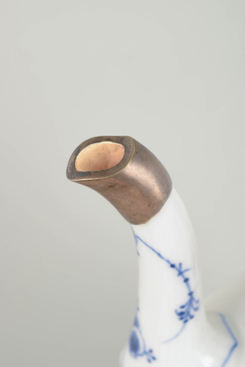 Introduced in 1775, Blue Fluted Plain is Royal Copenhagen’s oldest and most iconic service. In the early 20th century, silver-mounted repairs to spouts were a respected and practical solution, reflecting both craftsmanship and a desire to preserve valuable porcelain. Today, such pieces are appreciated for their authenticity, functionality, and visible history of use.