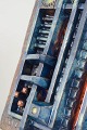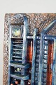 Abstract wall relief in stoneware with a strong, architectural composition and pronounced relief. The design is characterised by geometric forms and textured sections, combined with deep glazes in blue, copper brown, and rust red tones, typical of European studio ceramics of the 1970s.