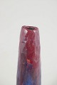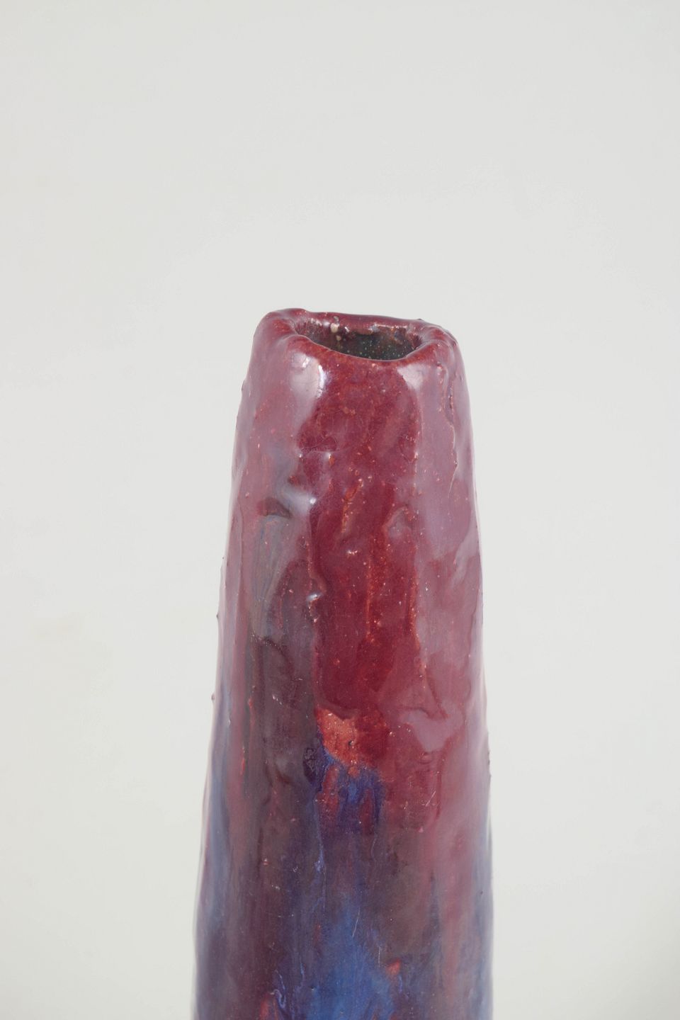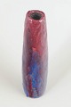 Tall and slender vase in stoneware with a lively, layered glaze in red and blue tones featuring pronounced vertical runs. The surface has a dynamic and expressive character, with the movement of the glaze playing a central role. The upright, restrained form emphasises its sculptural quality.
