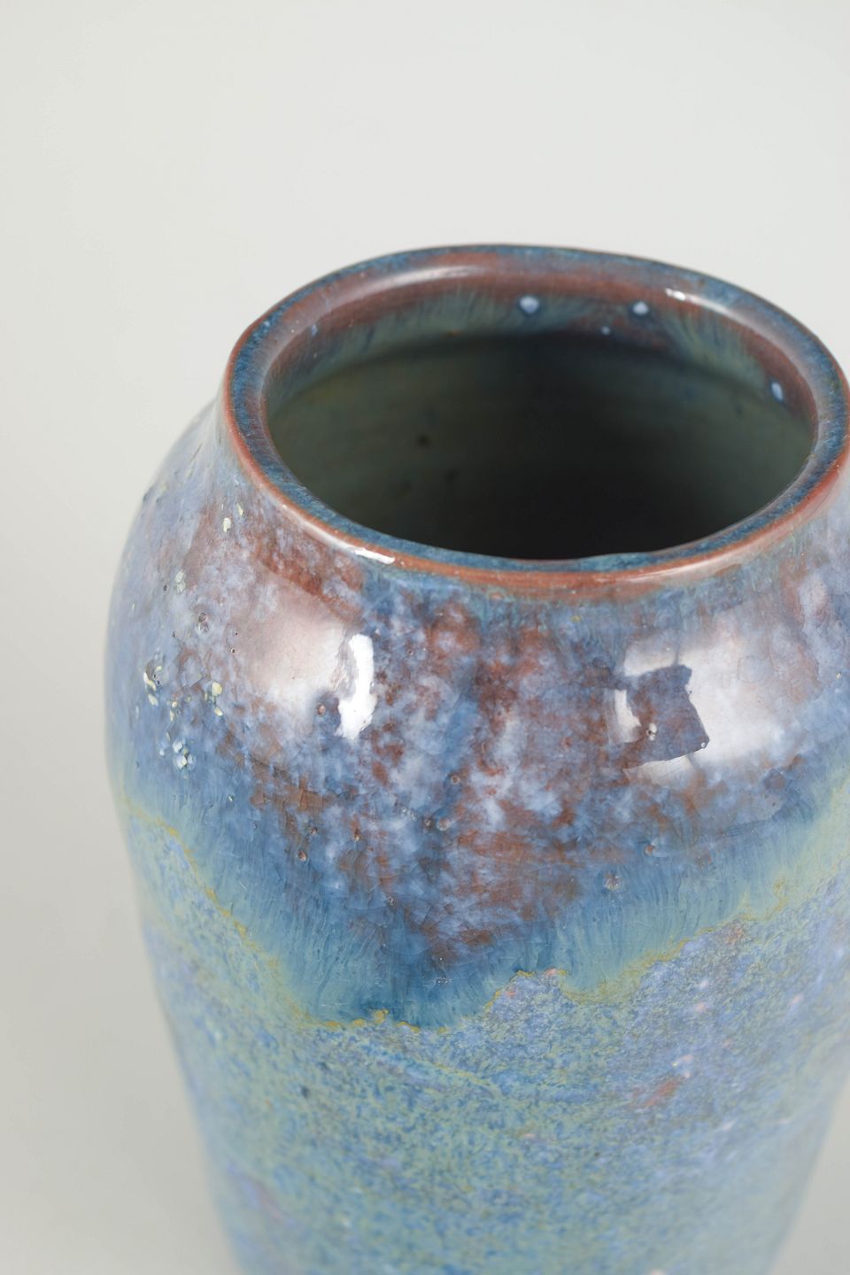 Elegant and well-balanced vase in stoneware with a glossy, layered glaze in blue and green tones with darker transitions at the neck. The surface shows a lively sense of depth, characteristic of the experimental glaze techniques of the period.