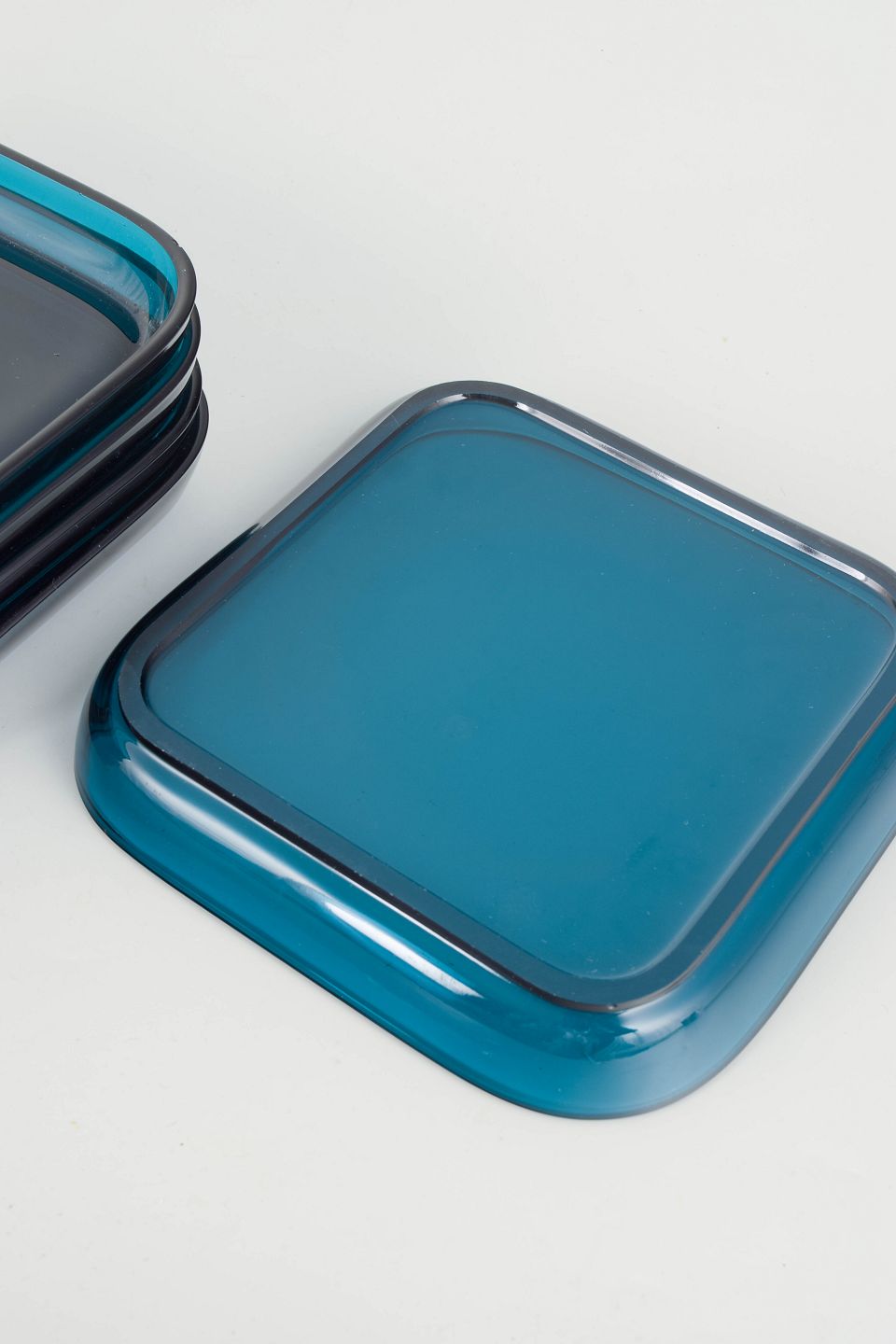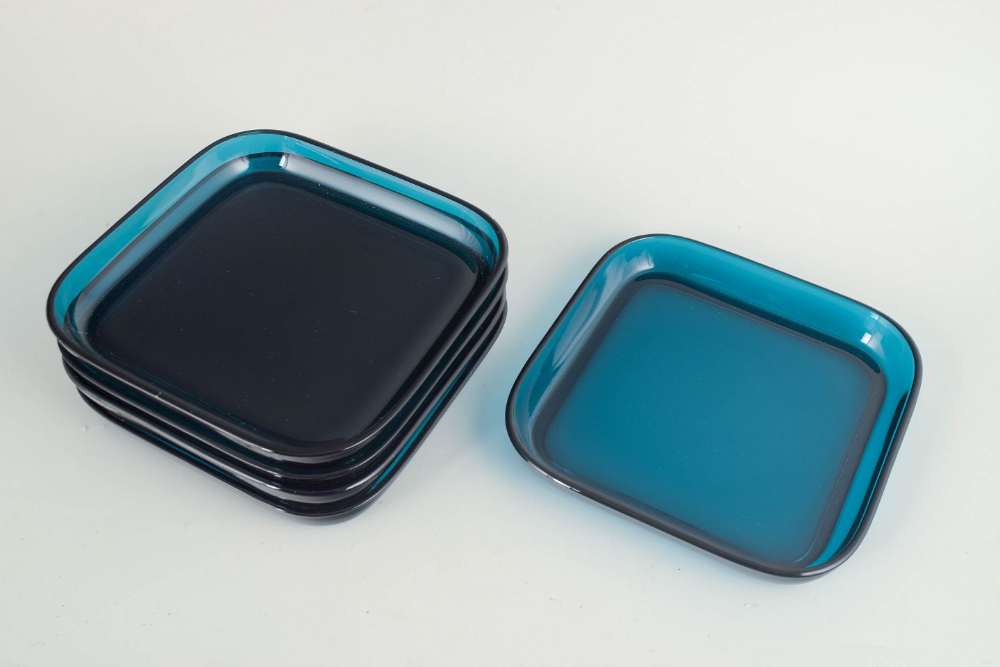Set comprising five shallow square dishes in handmade art glass with softly rounded corners and a transparent blue-green tone. A clean, restrained design with a gently raised rim and polished surfaces, where the light emphasises the depth and colour of the glass.