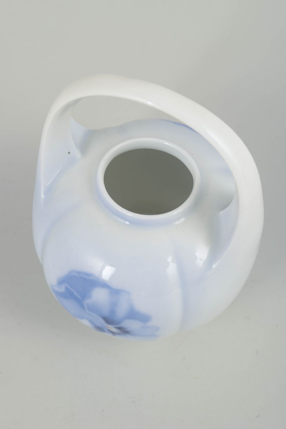 Porcelain vase with integrated handle and hand-painted underglaze decoration in Art Nouveau style, featuring a stylised floral motif in soft blue tones. Produced after Royal Copenhagen model 238/29b.